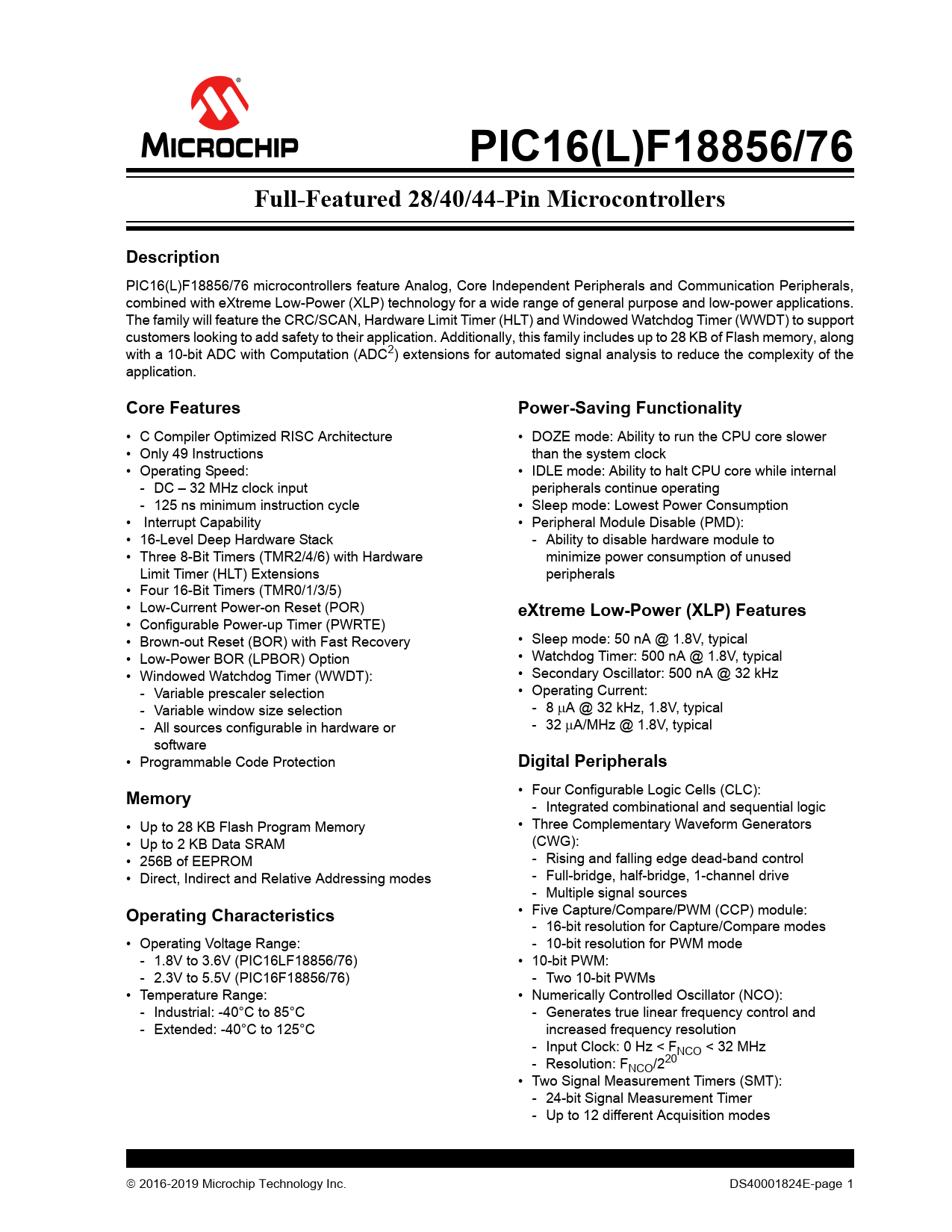 PIC16(L)F18856/76. Full-Featured 28/40/44-Pin Microcontrollers. Description. Core Features. Power-Saving Functionality