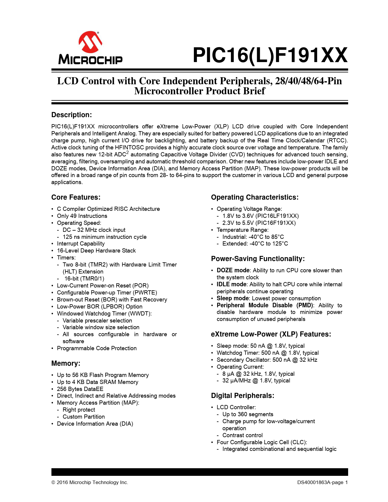 PIC16(L)F191XXLCD Control with Core Independent Peripherals, 28/40/48/64-PinMicrocontroller Product BriefDescription: PIC16(L)F191XX microcontrollers offer eXtreme Low-Power (XLP) LCD drive coupled with Core Independent Peripherals and Intelligent Analog. They are especially suited for battery powered LCD applications due to an integrated charge pump, high current I/O drive for backlighting, and battery backup of the Real Time Clock/Calendar (RTCC). Active clock tuning of the HFINTOSC provides a highly accurate clock source over voltage and temperature. The family also features new 12-bit ADC2 automating Capacitive Voltage Divider (CVD) techniques for advanced touch sensing, averaging, filtering, oversampling and automatic threshold comparison. Other new features include low-power IDLE and DOZE modes, Device Information Area (DIA), and Memory Access Partition (MAP). These low-power products will be offered in a broad range of pin counts from 28- to 64-pins to support the customer in various LCD and general purpose applications. Core Features:Operating Characteristics: • C Compiler Optimized RISC Architecture • Operating Voltage Range: • Only 49 Instructions - 1.8V to 3.6V (PIC16LF191XX) • Operating Speed: - 2.3V to 5.5V (PIC16F191XX) - DC – 32 MHz clock input • Temperature Range: - 125 ns minimum instruction cycle - Industrial: -40°C to 85°C • Interrupt Capability - Extended: -40°C to 125°C • 16-Level Deep Hardware Stack • Timers: Power-Saving Functionality: - Two 8-bit (TMR2) with Hardware Limit Timer (HLT) Extension • DOZE mode : Ability to run CPU core slower than - 16-bit (TMR0/1) the system clock • Low-Current Power-on Reset (POR) • IDLE mode : Ability to halt CPU core while internal • Configurable Power-up Timer (PWRTE) peripherals continue operating • Brown-out Reset (BOR) with Fast Recovery • Sleep mode : Lowest power consumption • Low-Power BOR (LPBOR) Option • Peripheral Module Disable (PMD) : Ability to • Windowed Watchdog Timer (WWDT): disable hardware module to minimize power - Variable prescaler selection consumption of unused peripherals - Variable window size selection - Al sources configurable in hardware or eXtreme Low-Power (XLP) Features: software • Programmable Code Protection • Sleep mode: 50 nA @ 1.8V, typical • Watchdog Timer: 500 nA @ 1.8V, typical • Secondary Oscillator: 500 nA @ 32 kHz Memory: • Operating Current: • Up to 56 KB Flash Program Memory - 8 µA @ 32 kHz, 1.8V, typical • Up to 4 KB Data SRAM Memory - 32 µA/MHz @ 1.8V, typical • 256 Bytes DataEE • Direct, Indirect and Relative Addressing modes Digital Peripherals: • Memory Access Partition (MAP): - Right protect • LCD Controller: - Custom Partition - Up to 360 segments • Device Information Area (DIA) - Charge pump for low-voltage/current operation - Contrast control • Four Configurable Logic Cel (CLC): - Integrated combinational and sequential logic 2016 Microchip Technology Inc. DS40001863A-page 1 Document Outline Description: Core Features: Memory: Operating Characteristics: Power-Saving Functionality: eXtreme Low-Power (XLP) Features: Digital Peripherals: Analog Peripherals: Flexible Oscillator Structure: TABLE 1: PIC16(L)F191XX Family Types TABLE 2: Packages Pin Diagrams FIGURE 1: 28-Pin SSOP, SPDIP and SOIC package Diagram for PIC16(L)F19155/56 FIGURE 2: 28-Pin UQFN Package Diagram For PIC16(L)F19155/56 FIGURE 3: 40-Pin PDIP Package Diagram For PIC16(L)F19175/76 FIGURE 4: 40-Pin UQFN (5x5X0.5) Package Diagram For PIC16(L)F19175/76 FIGURE 5: 44-Pin TQFP package Diagram for PIC16(L)F19175/76 FIGURE 6: 44-Pin QFN (8x8X0.9) Package Diagram For PIC16(L)F19175/76 FIGURE 7: 48-Pin TQFP/UQFN package Diagram for PIC16(L)F19185/86 FIGURE 8: 64-Pin TQFP/QFN package Diagram for PIC16(L)F19195/96/97 TABLE 3: 28-Pin Allocation Table (PIC16(L)F19155/56) TABLE 4: 40/44-Pin Allocation Table (PIC16(L)F19175/76) TABLE 5: 48-Pin Allocation Table (PIC16(L)F19185/86) TABLE 6: 64-Pin Allocation Table (PIC16(L)F19195/96/97) Trademarks Worldwide Sales