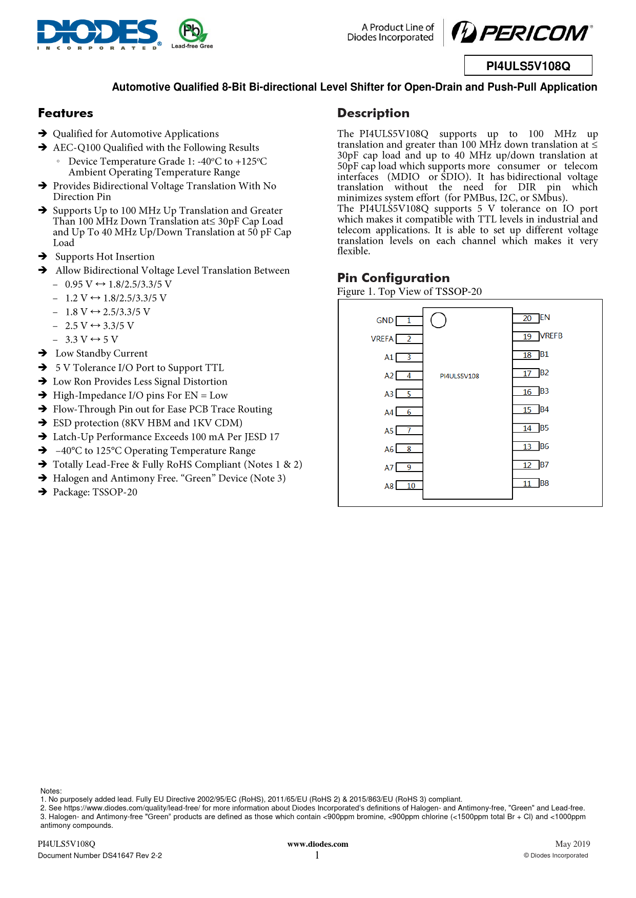 ↔ ↔ Figure 1. Top View of TSSOP-20 ↔ ↔ ↔ Notes: 1. No purposely added lead. Fully EU Directive 2002/95/EC (RoHS), 2011/65/EU (RoHS 2) & 2015/863/EU (RoHS 3) compliant. 2. See https://www.diodes.com/quality/lead-free/ for more information about Diodes Incorporated’s definitions of Halogen- and Antimony-free, "Green" and Lead-free. 3. Halogen- and Antimony-free "Green” products are defined as those which contain <900ppm bromine, <900ppm chlorine (<1500ppm total Br + Cl) and <1000ppm antimony compounds. PI4ULS5V108Q