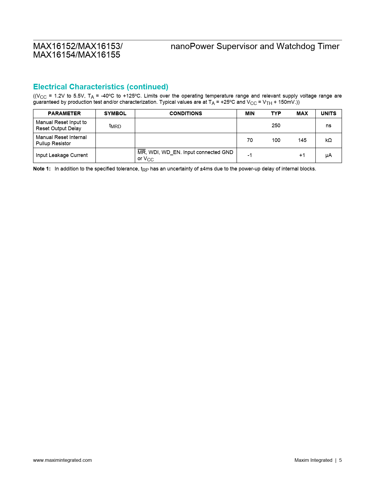 MAX16152/MAX16153/ nanoPower Supervisor and Watchdog Timer MAX16154/MAX16155 Electrical Characteristics (continued) ((VCC = 1.2V to 5.5V, TA = -40ºC to +125ºC. Limits over the operating temperature range and relevant supply voltage range are guaranteed by production test and/or characterization. Typical values are at TA = +25ºC and VCC = VTH + 150mV.)) PARAMETERSYMBOLCONDITIONSMINTYPMAXUNITS Manual Reset Input to t Reset Output Delay MRD 250 ns Manual Reset Internal 70 100 145 kΩ Pullup Resistor MR, WDI, WD_EN. Input connected GND Input Leakage Current -1 +1 µA or VCC Note 1: In addition to the specified tolerance, tRP has an uncertainty of ±4ms due to the power-up delay of internal blocks. www.maximintegrated.com Maxim Integrated | 5 Document Outline General Description Applications Benefits and Features Typical Application Circuit Absolute Maximum Ratings Package Information Electrical Characteristics Pin Configurations 6 WLP 6 SOT23 6 WLP 6 SOT23 Pin Description Functional Diagrams MAX16152/MAX16153 Block Diagram MAX16154/MAX16155 Block Diagram Detailed Description Input Threshold Watchdog Watchdog Startup Delay Watchdog Timeout Period Watchdog Enable Input (WD_EN) Watchdog Input Signal Reset Timeout Period Manual Reset Applications Information Power Supply Bypassing Watchdog Software Considerations Negative-Going VCC Transients Protection Selector Guide Ordering Information Revision History