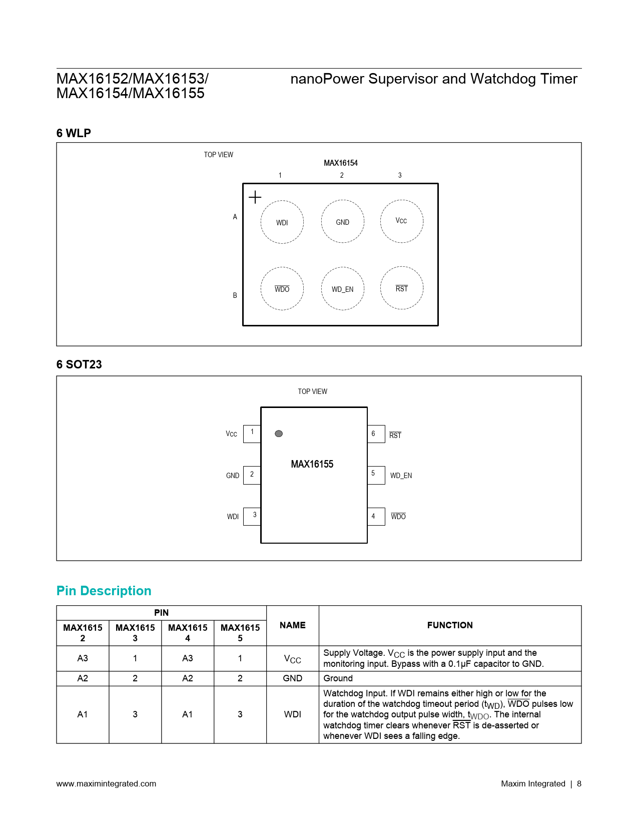 Supply Voltage. V A3 1 A3 1 V CC is the power supply input and the CC monitoring input. Bypass with a 0.1μF capacitor to GND. A2 2 A2 2 GND Ground Watchdog Input. If WDI remains either high or low for the duration of the watchdog timeout period (tWD), WDO pulses low A1 3 A1 3 WDI for the watchdog output pulse width, tWDO. The internal watchdog timer clears whenever RST is de-asserted or whenever WDI sees a falling edge. www.maximintegrated.com Maxim Integrated | 8 Document Outline General Description Applications Benefits and Features Typical Application Circuit Absolute Maximum Ratings Package Information Electrical Characteristics Pin Configurations 6 WLP 6 SOT23 6 WLP 6 SOT23 Pin Description Functional Diagrams MAX16152/MAX16153 Block Diagram MAX16154/MAX16155 Block Diagram Detailed Description Input Threshold Watchdog Watchdog Startup Delay Watchdog Timeout Period Watchdog Enable Input (WD_EN) Watchdog Input Signal Reset Timeout Period Manual Reset Applications Information Power Supply Bypassing Watchdog Software Considerations Negative-Going VCC Transients Protection Selector Guide Ordering Information Revision History