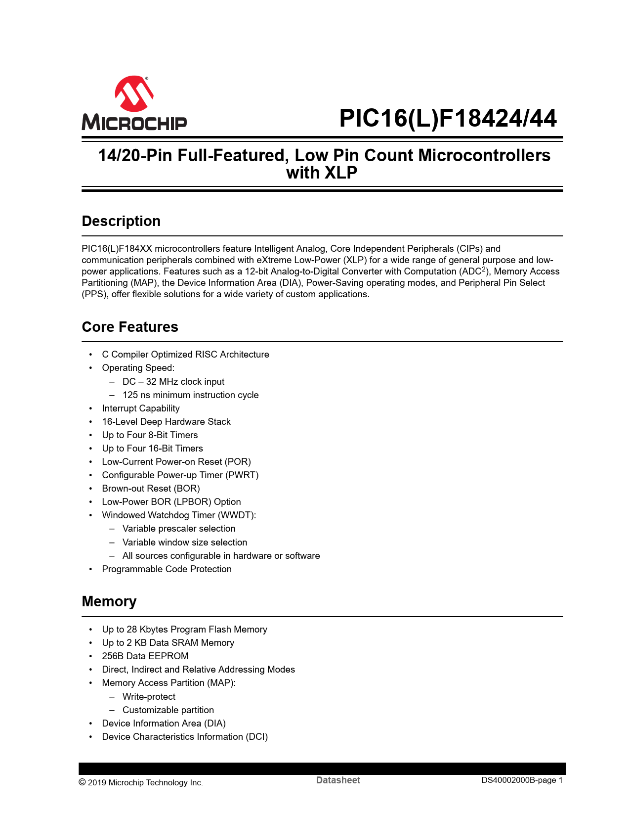 PIC16(L)F18424/44. 14/20-Pin Full-Featured, Low Pin Count Microcontrollers. with XLP. Description. Core Features. Memory. Datasheet