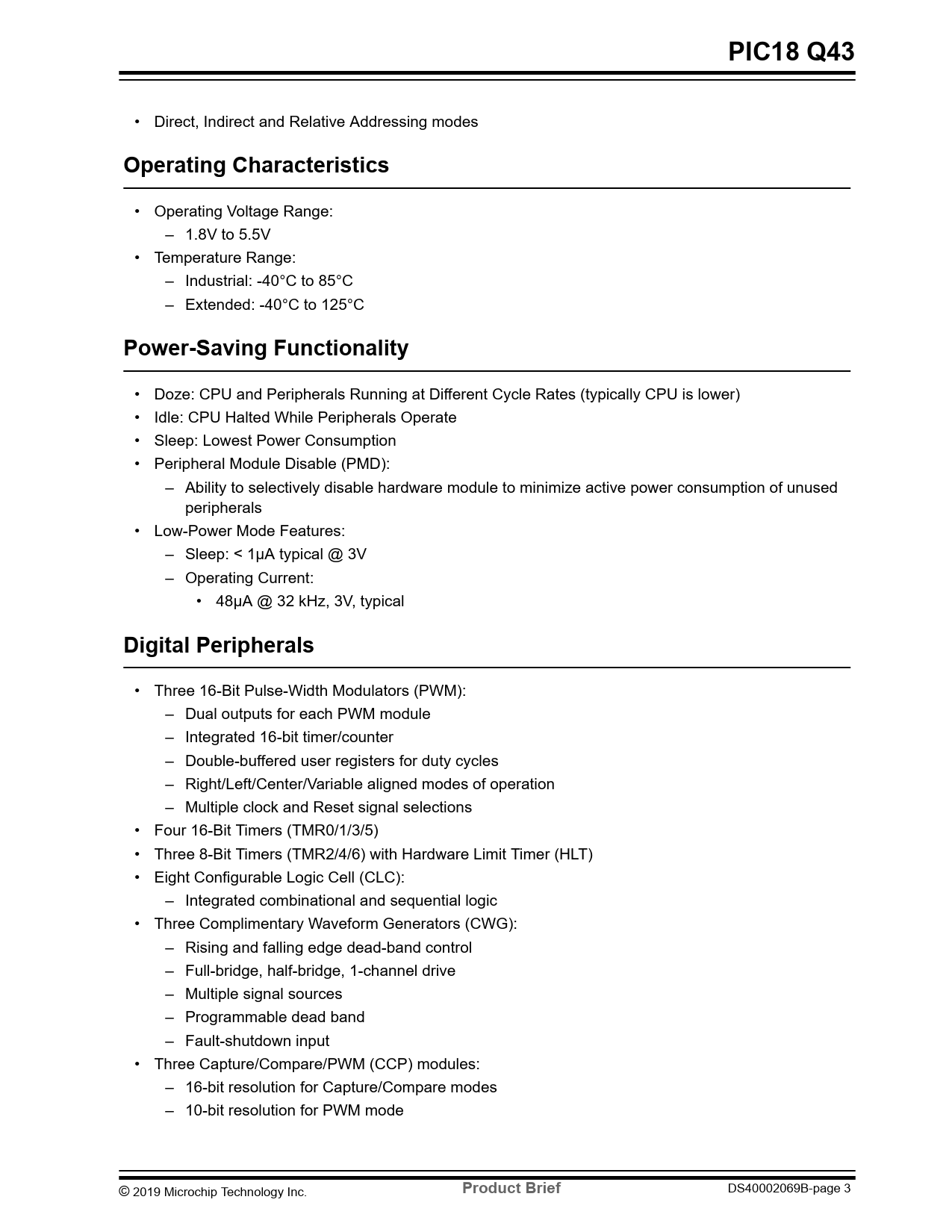 PIC18 Q43. Operating Characteristics. Power-Saving Functionality. Digital Peripherals. Product Brief