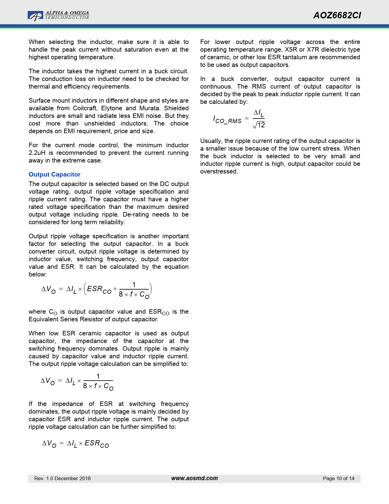 AOZ6682CI When selecting the inductor, make sure it is able to For lower output ripple voltage across the entire handle the peak current without saturation even at the operating temperature range, X5R or X7R dielectric type highest operating temperature. of ceramic, or other low ESR tantalum are recommended to be used as output capacitors. The inductor takes the highest current in a buck circuit. The conduction loss on inductor need to be checked for In a buck converter, output capacitor current is thermal and efficiency requirements. continuous. The RMS current of output capacitor is decided by the peak to peak inductor ripple current. It can Surface mount inductors in different shape and styles are be calculated by: available from Coilcraft, Elytone and Murata. Shielded I inductors are small and radiate less EMI noise. But they I L = ----- cost more than unshielded inductors. The choice CO_RMS 12 depends on EMI requirement, price and size. Usually, the ripple current rating of the output capacitor is For the current mode control, the minimum inductor a smaller issue because of the low current stress. When 2.2uH is recommended to prevent the current running the buck inductor is selected to be very small and away in the extreme case. inductor ripple current is high, output capacitor could be Output Capacitor overstressed. The output capacitor is selected based on the DC output voltage rating, output ripple voltage specification and ripple current rating. The capacitor must have a higher rated voltage specification than the maximum desired output voltage including ripple. De-rating needs to be considered for long term reliability. Output ripple voltage specification is another important factor for selecting the output capacitor. In a buck converter circuit, output ripple voltage is determined by inductor value, switching frequency, output capacitor value and ESR. It can be calculated by the equation below: 1 V = + ------------- O IL ESR CO 8 f C O where CO is output capacitor value and ESRCO is the Equivalent Series Resistor of output capacitor. When low ESR ceramic capacitor is used as output capacitor, the impedance of the capacitor at the switching frequency dominates. Output ripple is mainly caused by capacitor value and inductor ripple current. The output ripple voltage calculation can be simplified to: 1 V = ------------- O IL 8 f CO If the impedance of ESR at switching frequency dominates, the output ripple voltage is mainly decided by capacitor ESR and inductor ripple current. The output ripple voltage calculation can be further simplified to: V = O IL ESRCO Rev. 1.0 December 2018 www.aosmd.com Page 10 of 14