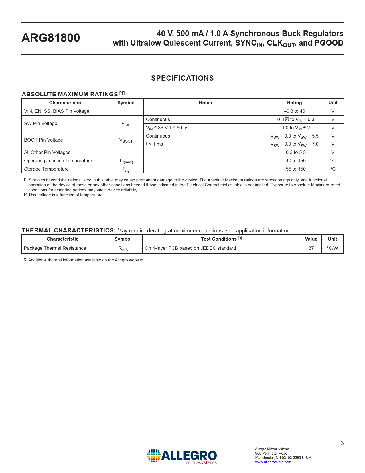 40 V, 500 mA / 1.0 A Synchronous Buck Regulators ARG81800 with Ultralow Quiescent Current, SYNCIN, CLKOUT, and PGOOD SPECIFICATIONS ABSOLUTE MAXIMUM RATINGS [1] Characteristic Symbol Notes Rating Unit