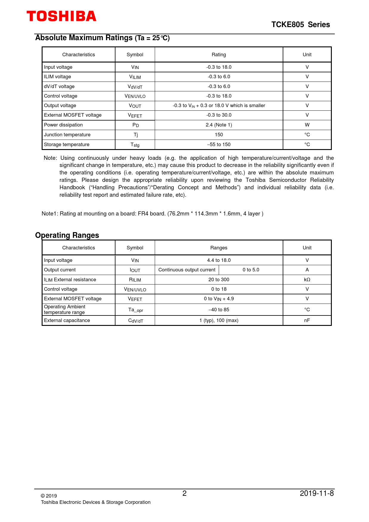 Characteristics Symbol Rating Unit Input voltage VIN -0.3 to 18.0 V ILIM voltage VILIM -0.3 to 6.0 V dV/dT voltage VdV/dT -0.3 to 6.0 V Control voltage VEN/UVLO -0.3 to 18.0 V Output voltage VOUT -0.3 to VIN + 0.3 or 18.0 V which is smaller V External MOSFET voltage VEFET -0.3 to 30.0 V Power dissipation PD 2.4 (Note 1) W Junction temperature Tj 150 °C Storage temperature Tstg − 55 to 150 °C Note: Using continuously under heavy loads (e.g. the application of high temperature/current/voltage and the significant change in temperature, etc.) may cause this product to decrease in the reliability significantly even if the operating conditions (i.e. operating temperature/current/voltage, etc.) are within the absolute maximum ratings. Please design the appropriate reliability upon reviewing the Toshiba Semiconductor Reliability Handbook (“Handling Precautions”/“Derating Concept and Methods”) and individual reliability data (i.e. reliability test report and estimated failure rate, etc). Note1: Rating at mounting on a board: FR4 board. (76.2mm * 114.3mm * 1.6mm, 4 layer )