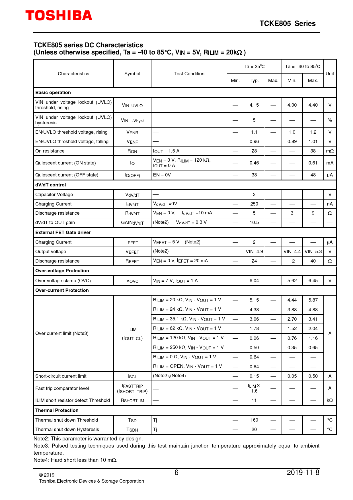TCKE805 Series TCKE805 series DC Characteristics (Unless otherwise specified, Ta = -40 to 85°C, VIN = 5V, RILIM = 20k