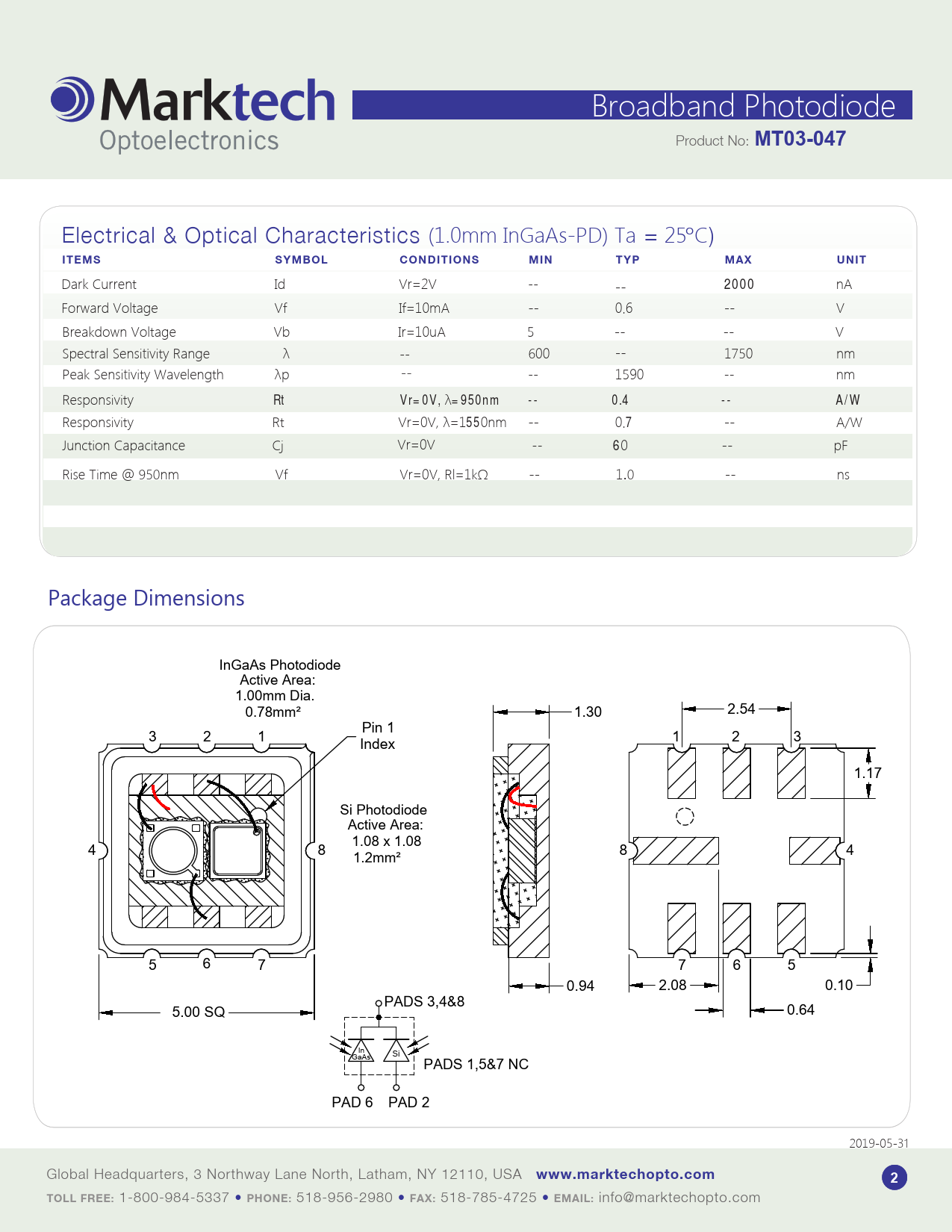 Dark Current Id Vr=2V -- -- 2000 nA Forward Voltage Vf If=10mA -- 0.6 -- V Breakdown Voltage Vb Ir=10uA 5 -- -- V Spectral Sensitivity Range λ -- 600 -- 1750 nm Peak Sensitivity Wavelength λp -- -- 1590 -- nm Responsivity Rt Vr=0V, λ=950nm -- 0.4 -- A/W Responsivity Rt Vr=0V, λ=1550nm -- 0.7 -- A/W Junction Capacitance Cj Vr=0V -- 60 -- pF Rise Time @ 950nm Vf Vr=0V, Rl=1kΩ -- 1.0 -- ns Package Dimensions InGaAs Photodiode Active Area: 1.00mm Dia. 0.78mm² 1.30 2.54 Pin 1 3 2 1 1 2 3 Index 1.17 Si Photodiode Active Area: 1.08 x 1.08 4 8 8 4 1.2mm² 5 6 7 7 6 5 0.94 2.08 0.10 PADS 3,4&8 5.00 SQ 0.64 In Si GaAs PADS 1,5&7 NC PAD 6 PAD 2 2019-05-31 Global Headquarters, 3 Northway Lane North, Latham, NY 12110, USA