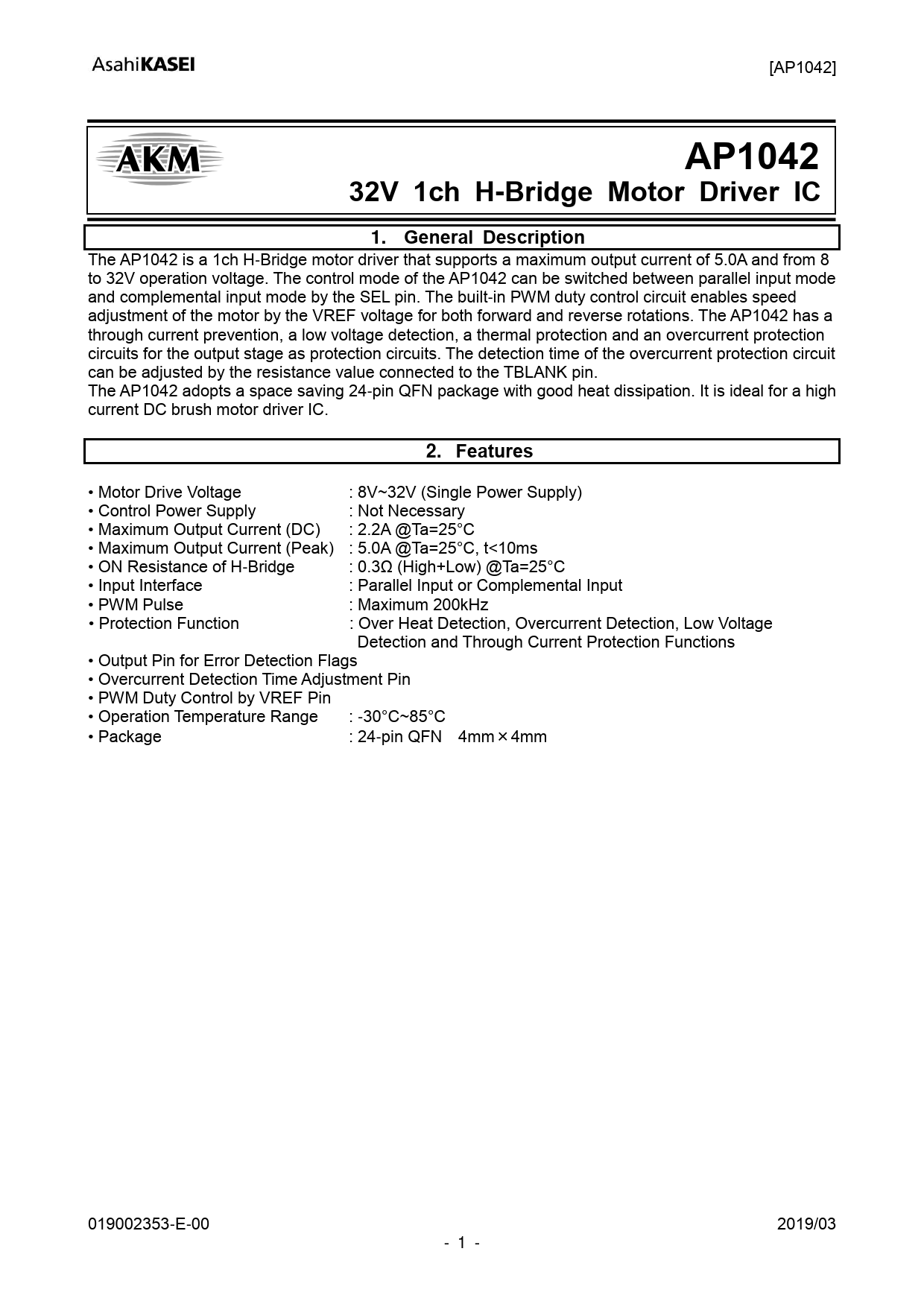AP1042. 32V 1ch H-Bridge Motor Driver IC. 1. General Description. 2. Features