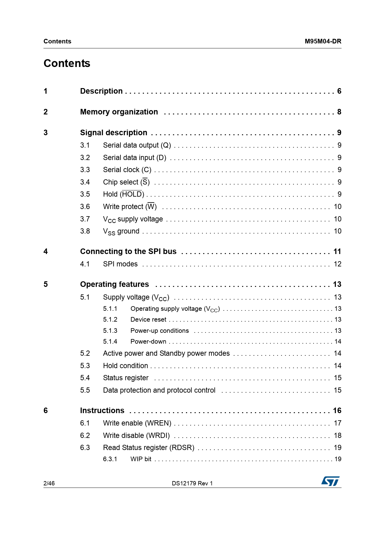 页数 / 页46 / 2 — Contents. M95M04-DR. Description . 6. Memory organization . 8. Signal …