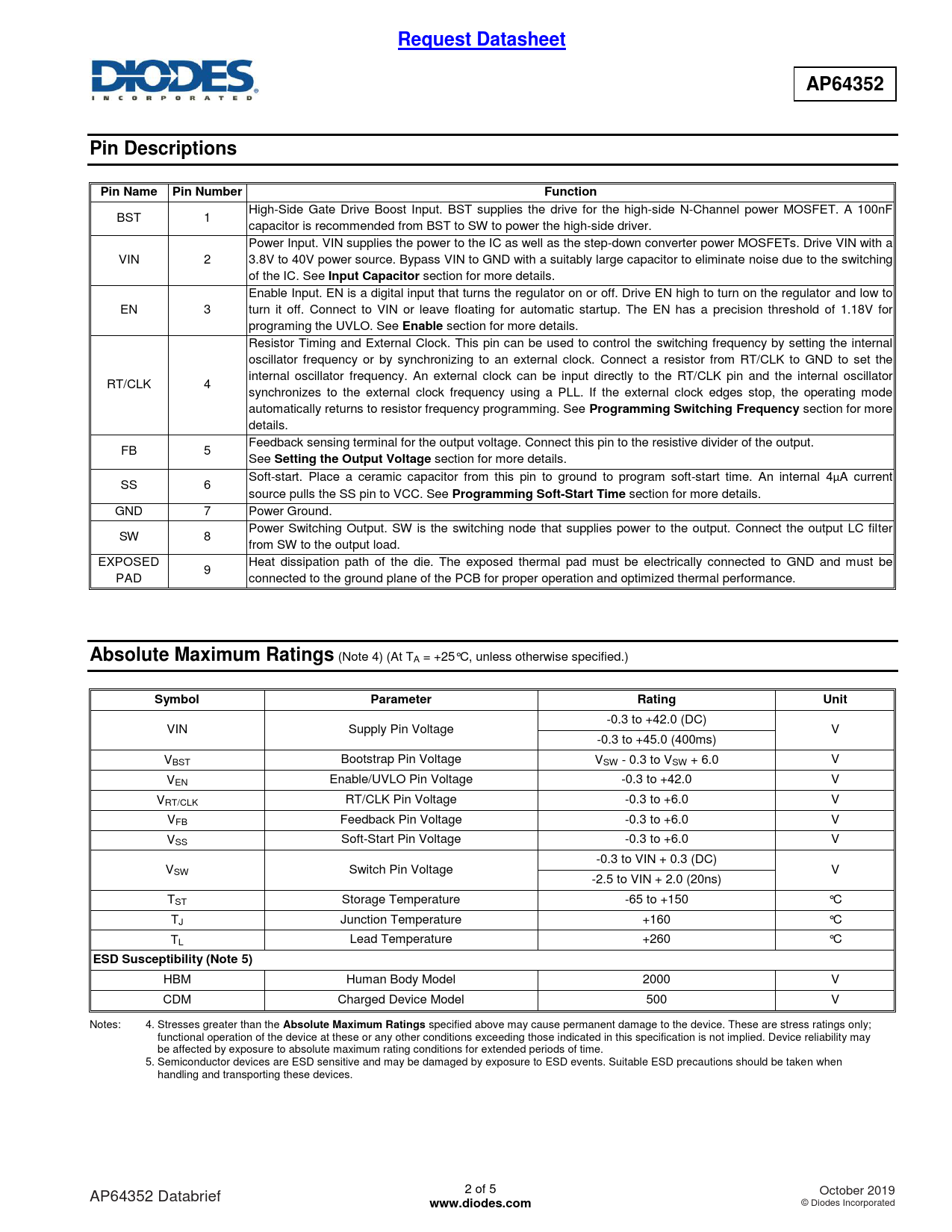 | 页数 / 页 | 5 / 2 — Request Datasheet. AP64352. Pin Descriptions. Pin Name. Pin Number. … |