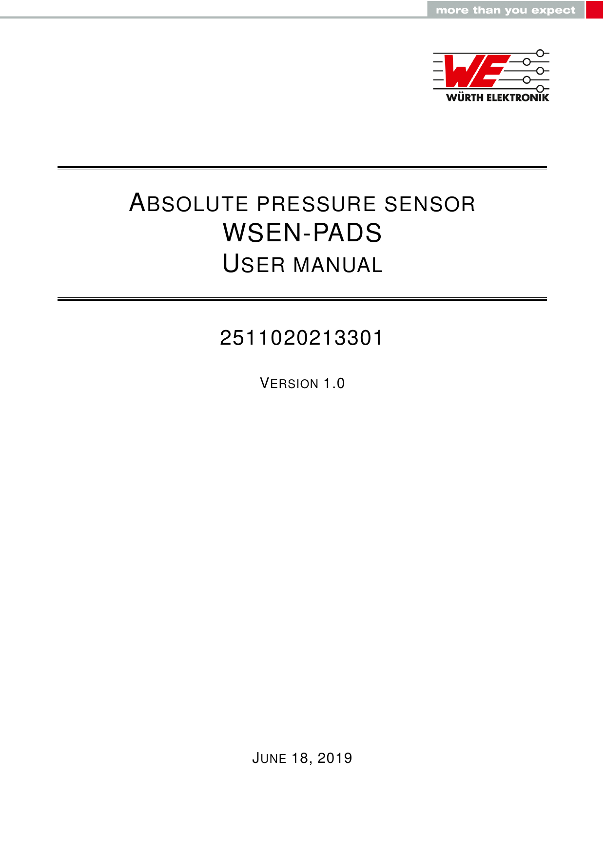 ABSOLUTE PRESSURE SENSOR WSEN-PADS USER MANUAL 2511020213301 VERSION 1.0 JUNE 18, 2019 Document Outline Introduction Application Key features Ordering information Block diagram Operational functionality MEMS Cell ASIC Calibration Digital filtering FIFO memory Filtering chain and data path Sensor specifications General information Absolute maximum ratings Pressure sensor specification Temperature sensor specification Electrical specifications Pinning information Pin configuration Pin description Digital interface General characteristics [fig:pinout]SDA and [fig:pinout]SCL logic levels Communication phase Idle state START(S) and STOP(P) condition Data validity Byte format Acknowledge(ACK) and No-Acknowledge(NACK) Slave address for the sensor Read/Write operation I2C timing parameters Application circuit Quick start guide Power-up sequence Communication with host controller Reboot Software reset Sensor operation: single conversion mode Sensor operation: continuous mode Power-off sequence Modes of operation Power-down mode Single conversion mode Continuous mode Additional configurations Low-power or low-noise configuration Enabling additional low-pass filter Reading output data Reading pressure values Reading temperature values Status register for reading the data FIFO buffer Bypass mode FIFO mode Continuous mode Bypass-to-FIFO mode Bypass-to-continuous mode Continuous-to-FIFO mode FIFO status monitoring and control User-defined FIFO threshold Reading data from FIFO buffer Interrupt functionality Interrupt generation on pressure data-ready Interrupt generation based on pressure threshold Interrupt latching FIFO status based interrupt events Routing interrupt events to the [fig:pinout]INT pin Register map Register description INT_CFG (0x0B) THR_P_L (0x0C) THR_P_H (0x0D) INTERFACE_CTRL (0x0E) DEVICE_ID (0x0F) CTRL_1 (0x10) CTRL_2 (0x11) CTRL_3 (0x12) FIFO_CTRL (0x13) FIFO_WTM (0x14) REF_P_L (0x15) REF_P_H (0x16) OPC_L (0x18) OPC_H (0x19) INT_SOURCE (0x24) FIFO_STATUS_1 (0x25) FIFO_STATUS_2 (0x26) STATUS (0x27) DATA_P_XL (0x28) DATA_P_L (0x29) DATA_P_H (0x2A) DATA_T_L (0x2B) DATA_T_H (0x2C) FIFO_DATA_P_XL (0x78) FIFO_DATA_P_L (0x79) FIFO_DATA_P_H (0x7A) FIFO_DATA_T_L (0x7B) FIFO_DATA_T_H (0x7A) Physical dimensions Sensor drawing Footprint Manufacturing information Moisture sensitivity level Soldering Reflow soldering Cleaning and washing Potting and coating Storage conditions Handling Important notes General customer responsibility Customer responsibility related to specific, in particular safety-relevant applications Best care and attention Customer support for product specifications Product improvements Product life cycle Property rights General terms and conditions Legal notice Exclusion of liability Suitability in customer applications Usage restriction License agreement for Würth Elektronik eiSos GmbH & Co. KG sensor product software and source code Limited license Usage and obligations Ownership Disclaimer of warranty Limitation of liability Applicable law and jurisdiction Severability clause Miscellaneous