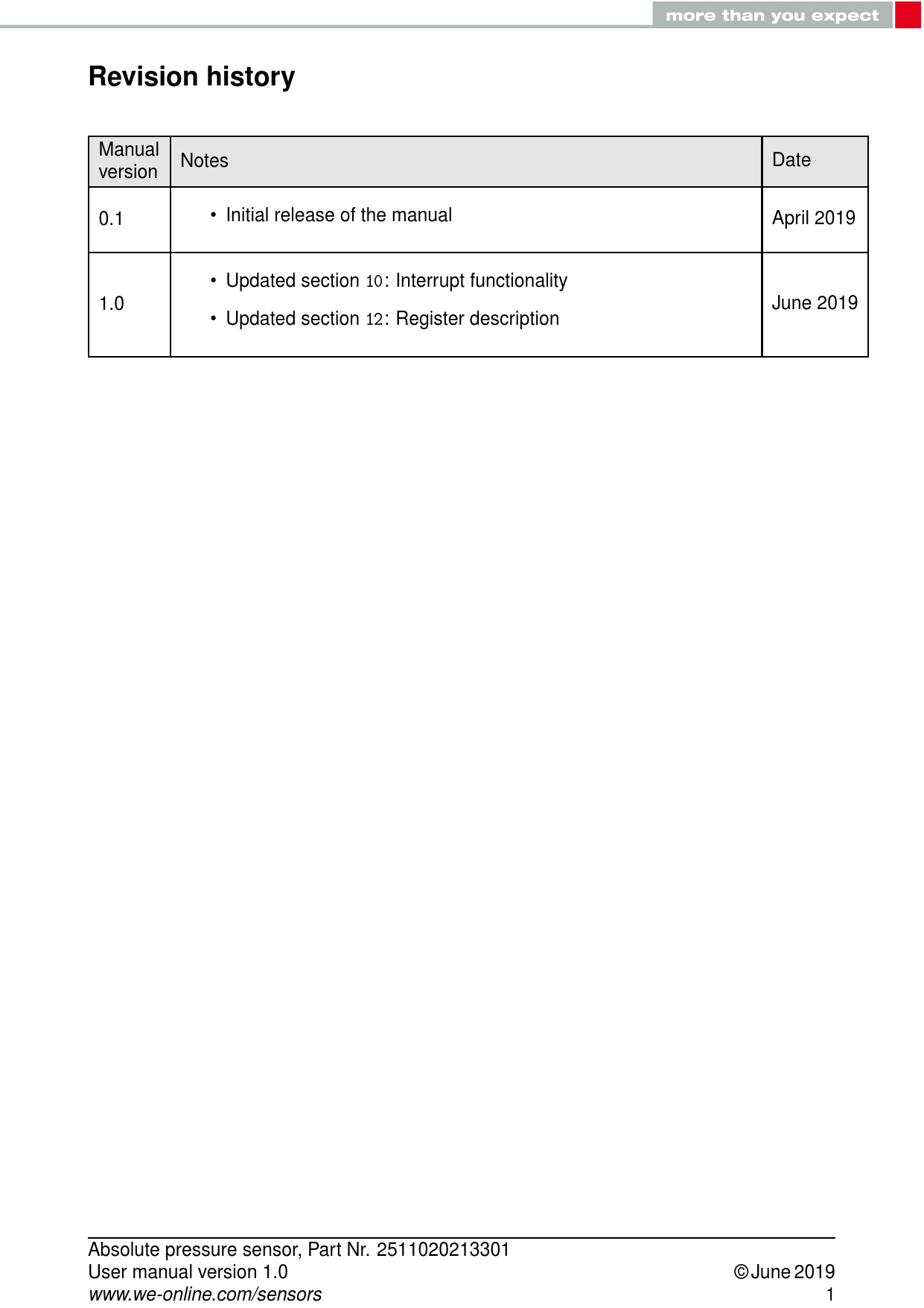 Manual Notes Date version 0.1 • Initial release of the manual April 2019 • Updated section 10: Interrupt functionality 1.0 June 2019 • Updated section 12: Register description Absolute pressure sensor, Part Nr. 2511020213301 User manual version 1.0 © June 2019 www.we-online.com/sensors 1 Document Outline Introduction Application Key features Ordering information Block diagram Operational functionality MEMS Cell ASIC Calibration Digital filtering FIFO memory Filtering chain and data path Sensor specifications General information Absolute maximum ratings Pressure sensor specification Temperature sensor specification Electrical specifications Pinning information Pin configuration Pin description Digital interface General characteristics [fig:pinout]SDA and [fig:pinout]SCL logic levels Communication phase Idle state START(S) and STOP(P) condition Data validity Byte format Acknowledge(ACK) and No-Acknowledge(NACK) Slave address for the sensor Read/Write operation I2C timing parameters Application circuit Quick start guide Power-up sequence Communication with host controller Reboot Software reset Sensor operation: single conversion mode Sensor operation: continuous mode Power-off sequence Modes of operation Power-down mode Single conversion mode Continuous mode Additional configurations Low-power or low-noise configuration Enabling additional low-pass filter Reading output data Reading pressure values Reading temperature values Status register for reading the data FIFO buffer Bypass mode FIFO mode Continuous mode Bypass-to-FIFO mode Bypass-to-continuous mode Continuous-to-FIFO mode FIFO status monitoring and control User-defined FIFO threshold Reading data from FIFO buffer Interrupt functionality Interrupt generation on pressure data-ready Interrupt generation based on pressure threshold Interrupt latching FIFO status based interrupt events Routing interrupt events to the [fig:pinout]INT pin Register map Register description INT_CFG (0x0B) THR_P_L (0x0C) THR_P_H (0x0D) INTERFACE_CTRL (0x0E) DEVICE_ID (0x0F) CTRL_1 (0x10) CTRL_2 (0x11) CTRL_3 (0x12) FIFO_CTRL (0x13) FIFO_WTM (0x14) REF_P_L (0x15) REF_P_H (0x16) OPC_L (0x18) OPC_H (0x19) INT_SOURCE (0x24) FIFO_STATUS_1 (0x25) FIFO_STATUS_2 (0x26) STATUS (0x27) DATA_P_XL (0x28) DATA_P_L (0x29) DATA_P_H (0x2A) DATA_T_L (0x2B) DATA_T_H (0x2C) FIFO_DATA_P_XL (0x78) FIFO_DATA_P_L (0x79) FIFO_DATA_P_H (0x7A) FIFO_DATA_T_L (0x7B) FIFO_DATA_T_H (0x7A) Physical dimensions Sensor drawing Footprint Manufacturing information Moisture sensitivity level Soldering Reflow soldering Cleaning and washing Potting and coating Storage conditions Handling Important notes General customer responsibility Customer responsibility related to specific, in particular safety-relevant applications Best care and attention Customer support for product specifications Product improvements Product life cycle Property rights General terms and conditions Legal notice Exclusion of liability Suitability in customer applications Usage restriction License agreement for Würth Elektronik eiSos GmbH & Co. KG sensor product software and source code Limited license Usage and obligations Ownership Disclaimer of warranty Limitation of liability Applicable law and jurisdiction Severability clause Miscellaneous