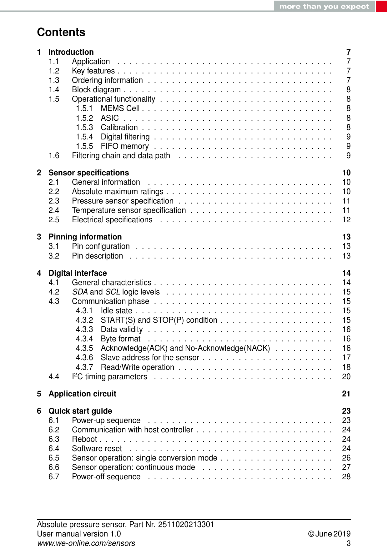 6.1 Power-up sequence . 23 6.2 Communication with host controller . 24 6.3 Reboot . 24 6.4 Software reset . 24 6.5 Sensor operation: single conversion mode . 26 6.6 Sensor operation: continuous mode . 27 6.7 Power-off sequence . 28 Absolute pressure sensor, Part Nr. 2511020213301 User manual version 1.0 © June 2019 www.we-online.com/sensors 3 Document Outline Introduction Application Key features Ordering information Block diagram Operational functionality MEMS Cell ASIC Calibration Digital filtering FIFO memory Filtering chain and data path Sensor specifications General information Absolute maximum ratings Pressure sensor specification Temperature sensor specification Electrical specifications Pinning information Pin configuration Pin description Digital interface General characteristics [fig:pinout]SDA and [fig:pinout]SCL logic levels Communication phase Idle state START(S) and STOP(P) condition Data validity Byte format Acknowledge(ACK) and No-Acknowledge(NACK) Slave address for the sensor Read/Write operation I2C timing parameters Application circuit Quick start guide Power-up sequence Communication with host controller Reboot Software reset Sensor operation: single conversion mode Sensor operation: continuous mode Power-off sequence Modes of operation Power-down mode Single conversion mode Continuous mode Additional configurations Low-power or low-noise configuration Enabling additional low-pass filter Reading output data Reading pressure values Reading temperature values Status register for reading the data FIFO buffer Bypass mode FIFO mode Continuous mode Bypass-to-FIFO mode Bypass-to-continuous mode Continuous-to-FIFO mode FIFO status monitoring and control User-defined FIFO threshold Reading data from FIFO buffer Interrupt functionality Interrupt generation on pressure data-ready Interrupt generation based on pressure threshold Interrupt latching FIFO status based interrupt events Routing interrupt events to the [fig:pinout]INT pin Register map Register description INT_CFG (0x0B) THR_P_L (0x0C) THR_P_H (0x0D) INTERFACE_CTRL (0x0E) DEVICE_ID (0x0F) CTRL_1 (0x10) CTRL_2 (0x11) CTRL_3 (0x12) FIFO_CTRL (0x13) FIFO_WTM (0x14) REF_P_L (0x15) REF_P_H (0x16) OPC_L (0x18) OPC_H (0x19) INT_SOURCE (0x24) FIFO_STATUS_1 (0x25) FIFO_STATUS_2 (0x26) STATUS (0x27) DATA_P_XL (0x28) DATA_P_L (0x29) DATA_P_H (0x2A) DATA_T_L (0x2B) DATA_T_H (0x2C) FIFO_DATA_P_XL (0x78) FIFO_DATA_P_L (0x79) FIFO_DATA_P_H (0x7A) FIFO_DATA_T_L (0x7B) FIFO_DATA_T_H (0x7A) Physical dimensions Sensor drawing Footprint Manufacturing information Moisture sensitivity level Soldering Reflow soldering Cleaning and washing Potting and coating Storage conditions Handling Important notes General customer responsibility Customer responsibility related to specific, in particular safety-relevant applications Best care and attention Customer support for product specifications Product improvements Product life cycle Property rights General terms and conditions Legal notice Exclusion of liability Suitability in customer applications Usage restriction License agreement for Würth Elektronik eiSos GmbH & Co. KG sensor product software and source code Limited license Usage and obligations Ownership Disclaimer of warranty Limitation of liability Applicable law and jurisdiction Severability clause Miscellaneous