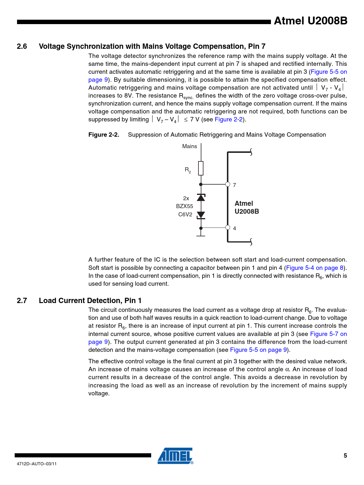 link to page 9 link to page 9 link to page 5 link to page 8 link to page 9 link to page 9 link to page 9 Atmel U2008B2.6Voltage Synchronization with Mains Voltage Compensation, Pin 7 The voltage detector synchronizes the reference ramp with the mains supply voltage. At the same time, the mains-dependent input current at pin 7 is shaped and rectified internally. This current activates automatic retriggering and at the same time is available at pin 3 (Figure 5-5 on page 9). By suitable dimensioning, it is possible to attain the specified compensation effect. Automatic retriggering and mains voltage compensation are not activated until ⏐ V - V ⏐ 7 4 increases to 8V. The resistance R defines the width of the zero voltage cross-over pulse, sync. synchronization current, and hence the mains supply voltage compensation current. If the mains voltage compensation and the automatic retriggering are not required, both functions can be suppressed by limiting ⏐ V – V ⏐ ≤ 7 V (see Figure 2-2). 7 4 Figure 2-2. Suppression of Automatic Retriggering and Mains Voltage Compensation Mains R2 7 2x Atmel BZX55 U2008B C6V2 4 A further feature of the IC is the selection between soft start and load-current compensation. Soft start is possible by connecting a capacitor between pin 1 and pin 4 (Figure 5-4 on page 8). In the case of load-current compensation, pin 1 is directly connected with resistance R , which is 6 used for sensing load current. 2.7Load Current Detection, Pin 1 The circuit continuously measures the load current as a voltage drop at resistor R . The evalua- 6 tion and use of both half waves results in a quick reaction to load-current change. Due to voltage at resistor R , there is an increase of input current at pin 1. This current increase controls the 6 internal current source, whose positive current values are available at pin 3 (see Figure 5-7 on page 9). The output current generated at pin 3 contains the difference from the load-current detection and the mains-voltage compensation (see Figure 5-5 on page 9). The effective control voltage is the final current at pin 3 together with the desired value network. An increase of mains voltage causes an increase of the control angle α. An increase of load current results in a decrease of the control angle. This avoids a decrease in revolution by increasing the load as well as an increase of revolution by the increment of mains supply voltage. 5 4712D–AUTO–03/11 Document Outline Features Applications 1. Description 2. Pin Configuration 2.1 Mains Supply, Pin 5 2.2 Voltage Monitoring 2.3 Phase Control, Pin 6 2.4 Automatic Retriggering 2.5 Current Synchronization, Pin 8 2.6 Voltage Synchronization with Mains Voltage Compensation, Pin 7 2.7 Load Current Detection, Pin 1 3. Absolute Maximum Ratings 4. Thermal Resistance 5. Electrical Characteristics 6. Ordering Information 7. Package Information 8. Revision History