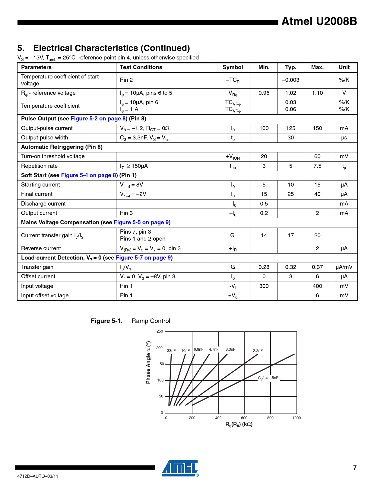 4712D–AUTO–03/11 Document Outline Features Applications 1. Description 2. Pin Configuration 2.1 Mains Supply, Pin 5 2.2 Voltage Monitoring 2.3 Phase Control, Pin 6 2.4 Automatic Retriggering 2.5 Current Synchronization, Pin 8 2.6 Voltage Synchronization with Mains Voltage Compensation, Pin 7 2.7 Load Current Detection, Pin 1 3. Absolute Maximum Ratings 4. Thermal Resistance 5. Electrical Characteristics 6. Ordering Information 7. Package Information 8. Revision History