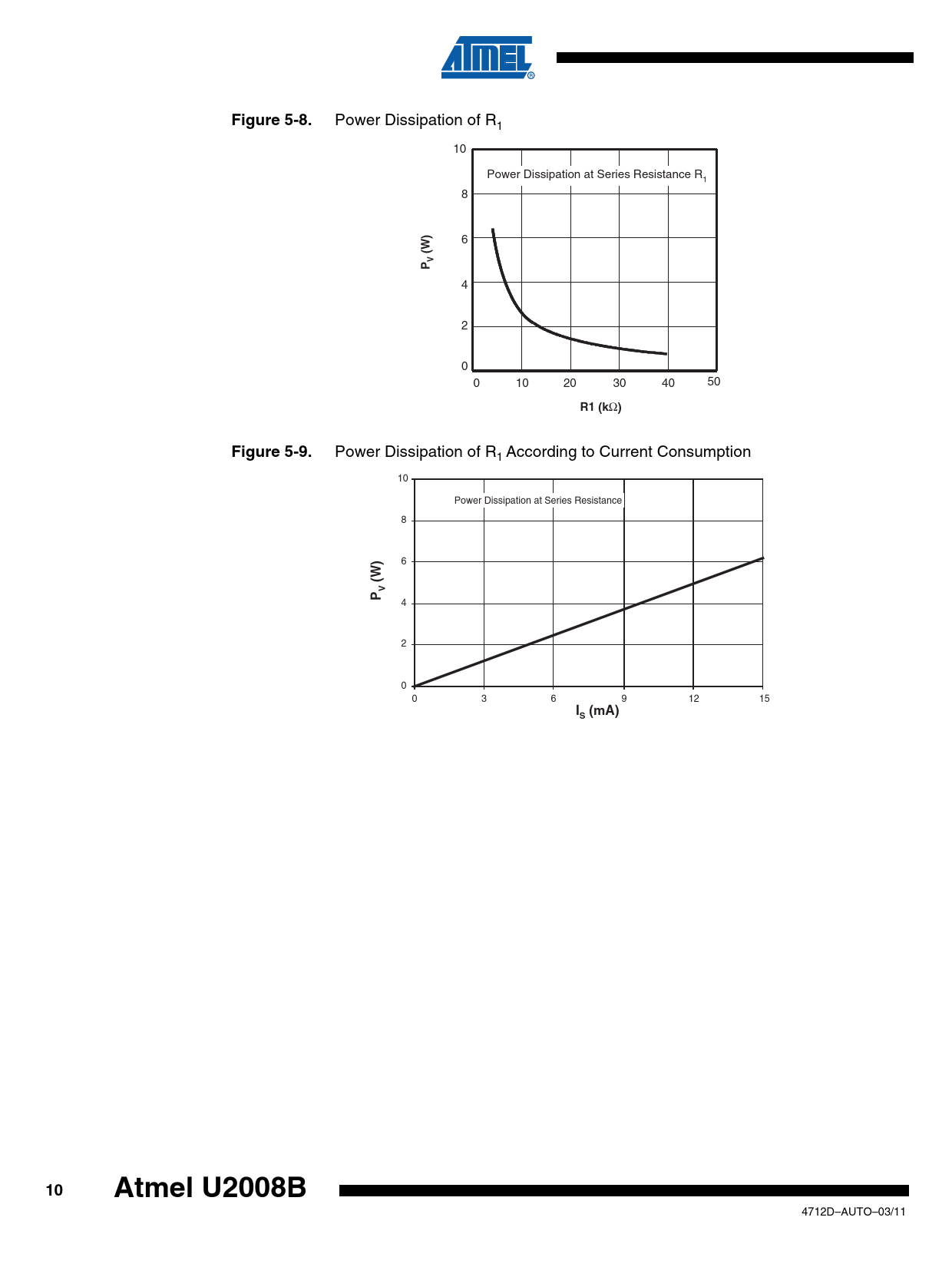 Figure 5-8. Power Dissipation of R1 10 Power Dissipation at Series Resistance R1 8 ) 6 (W V P 4 2 0 0 10 20 30 40 50 R1 (k Ω )Figure 5-9. Power Dissipation of R According to Current Consumption 1 10 Power Dissipation at Series Resistance 8 6 (W) V P 4 2 0 0 3 6 9 12 15 I (mA)S10Atmel U2008B 4712D–AUTO–03/11 Document Outline Features Applications 1. Description 2. Pin Configuration 2.1 Mains Supply, Pin 5 2.2 Voltage Monitoring 2.3 Phase Control, Pin 6 2.4 Automatic Retriggering 2.5 Current Synchronization, Pin 8 2.6 Voltage Synchronization with Mains Voltage Compensation, Pin 7 2.7 Load Current Detection, Pin 1 3. Absolute Maximum Ratings 4. Thermal Resistance 5. Electrical Characteristics 6. Ordering Information 7. Package Information 8. Revision History