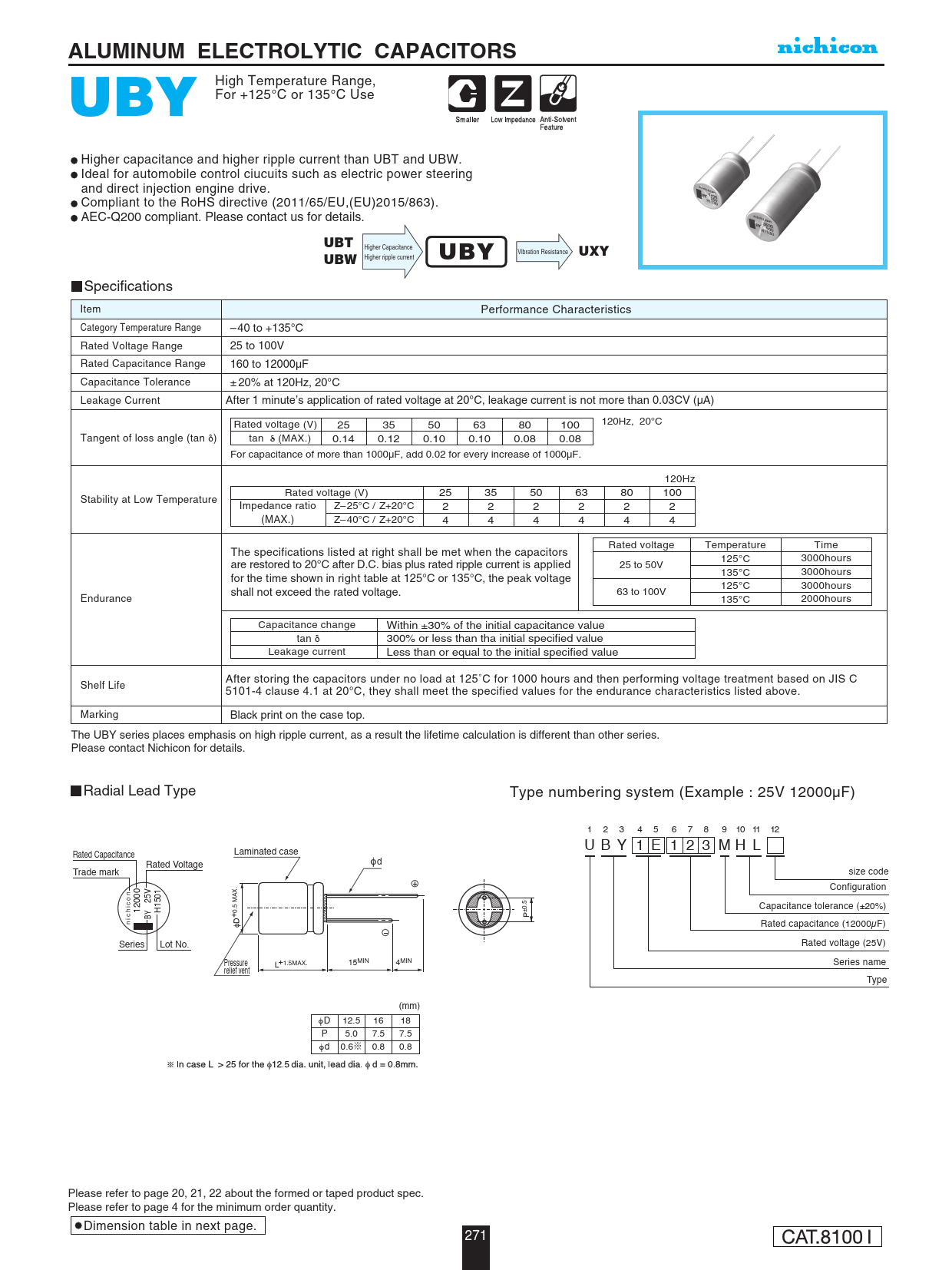 ALUMINUM ELECTROLYTIC CAPACITORSUBY High Temperature Range, For +125°C or 135°C Use Higher capacitance and higher ripple current than UBT and UBW. Ideal for automobile control ciucuits such as electric power steering and direct injection engine drive. Compliant to the RoHS directive (2011/65/EU,(EU)2015/863). AEC-Q200 compliant. Please contact us for details. UBT Higher Capacitance Vibration Resistance UXY Higher ripple current UBWUBY Specifications Item Performance Characteristics Category Temperature Range –40 to +135°C Rated Voltage Range 25 to 100V Rated Capacitance Range 160 to 12000µF Capacitance Tolerance ± 20% at 120Hz, 20°C Leakage Current After 1 minute’s application of rated voltage at 20°C, leakage current is not more than 0.03CV (µA) 120Hz, 20°C Rated voltage (V) 25 35 50 63 80 100 Tangent of loss angle (tan δ) tan δ (MAX.) 0.14 0.12 0.10 0.10 0.08 0.08 For capacitance of more than 1000µF, add 0.02 for every increase of 1000µF. 120Hz Rated voltage (V) 25 35 50 63 80 100 Stability at Low Temperature Impedance ratio Z–25°C / Z+20°C 2 2 2 2 2 2 (MAX.) Z–40°C / Z+20°C 4 4 4 4 4 4 Rated voltage Time The specifications listed at right shall be met when the capacitors Temperature are restored to 20°C after D.C. bias plus rated ripple current is applied 125°C 3000hours 25 to 50V for the time shown in right table at 125°C or 135°C, the peak voltage 135°C 3000hours shall not exceed the rated voltage. 125°C 3000hours 63 to 100V Endurance 135°C 2000hours Capacitance change Within ±30% of the initial capacitance value tan δ 300% or less than tha initial specified value Leakage current Less than or equal to the initial specified value After storing the capacitors under no load at 125˚C for 1000 hours and then performing voltage treatment based on JIS C Shelf Life 5101-4 clause 4.1 at 20°C, they shall meet the specified values for the endurance characteristics listed above. Marking Black print on the case top. The UBY series places emphasis on high ripple current, as a result the lifetime calculation is different than other series. Please contact Nichicon for details. Radial Lead Type Type numbering system (Example : 25V 12000µF) 1 2 3 4 5 6 7 8 9 10 11 12 Laminated case U B Y 1 E 1 2 3 M H L Rated Capacitance Rated Voltage φd Trade mark size code Configuration n 25V ico Capacitance tolerance (±20%) 12000 H1501 ±0.5 ich BY +0.5 MAX. P n Dφ Rated capacitance (12000µF) Series Lot No. Rated voltage (25V) Pressure 15MIN 4MIN L+1.5MAX. Series name relief vent Type (mm) φD 12.5 16 18 P 5.0 7.5 7.5 φd 0.6※ 0.8 0.8 Please refer to page 20, 21, 22 about the formed or taped product spec. Please refer to page 4 for the minimum order quantity. Dimension table in next page. 271