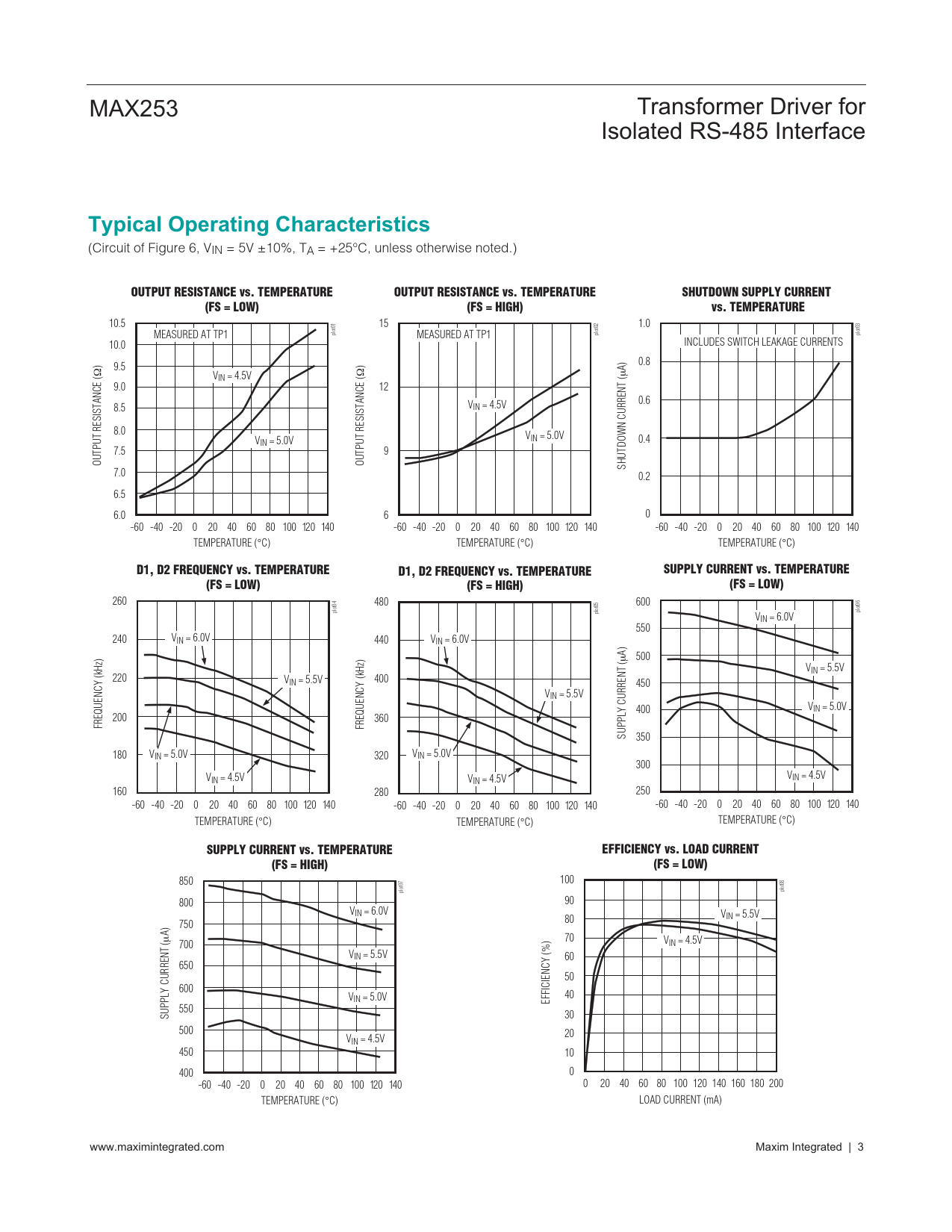850 100 plot07 plot08 800 90 VIN = 6.0V V 80 IN = 5.5V 750 μA) 70 700 VIN = 4.5V VIN = 5.5V 60 650 50 600 V 40 IN = 5.0V EFFICIENCY (%) 550 SUPPLY CURRENT ( 30 500 20 VIN = 4.5V 450 10 400 0 -60 -40 -20 0 20 40 60 80 100 120 140 0 20 40 60 80 100 120 140 160 180 200 TEMPERATURE (°C) LOAD CURRENT (mA) www.maximintegrated.com Maxim Integrated | 3