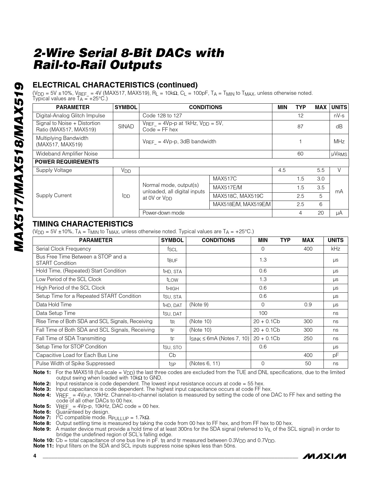 (VDD = 5V ±10%, VREF_ = 4V (MAX517, MAX519), RL = 10kΩ, CL = 100pF, TA = TMIN to TMAX, unless otherwise noted. Typical values are TA = +25°C.)