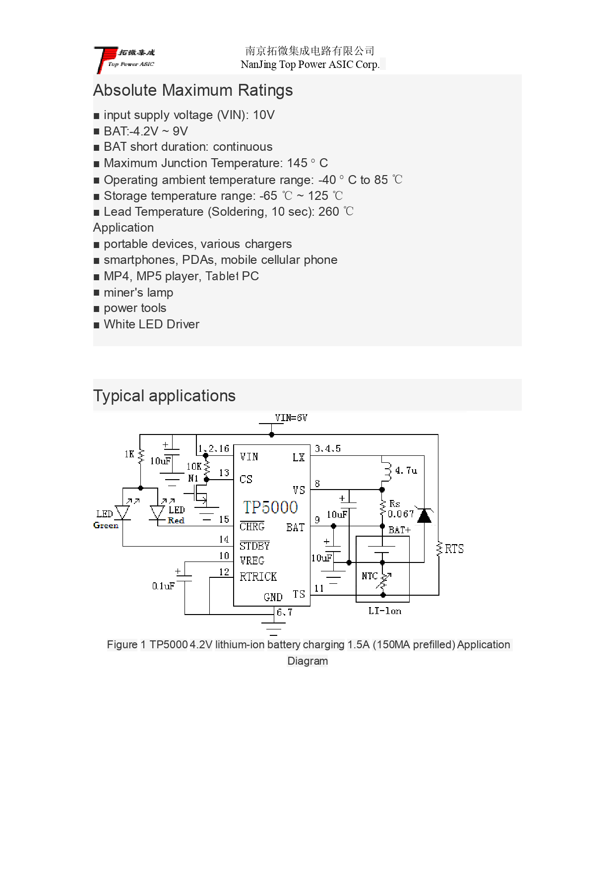 南京拓微集成电路有限公司 NanJing Top Power ASIC Corp. Absolute Maximum Ratings ■ input supply voltage (VIN): 10V ■ BAT:-4.2V ~ 9V ■ BAT short duration: continuous ■ Maximum Junction Temperature: 145 ° C ■ Operating ambient temperature range: -40 ° C to 85 ℃ ■ Storage temperature range: -65 ℃ ~ 125 ℃ ■ Lead Temperature (Soldering, 10 sec): 260 ℃ Application ■ portable devices, various chargers ■ smartphones, PDAs, mobile cel ular phone ■ MP4, MP5 player, Tablet PC ■ miner's lamp ■ power tools ■ White LED Driver Typical applications Figure 1 TP5000 4.2V lithium-ion battery charging 1.5A (150MA prefilled) Application Diagram