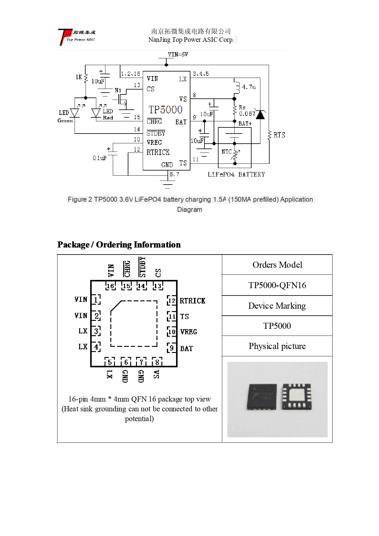 Orders Model TP5000-QFN16 Device Marking TP5000 Physical picture 16-pin 4mm * 4mm QFN 16 package top view (Heat sink grounding can not be connected to other potential)