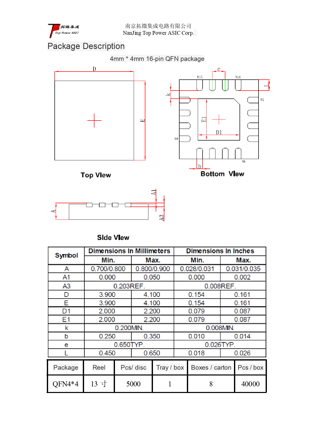 南京拓微集成电路有限公司 NanJing Top Power ASIC Corp. Package Description 4mm * 4mm 16-pin QFN package Package Reel Pcs/ disc Tray / box Boxes / carton Pcs / box QFN4*4 13 寸 5000 1 8 40000