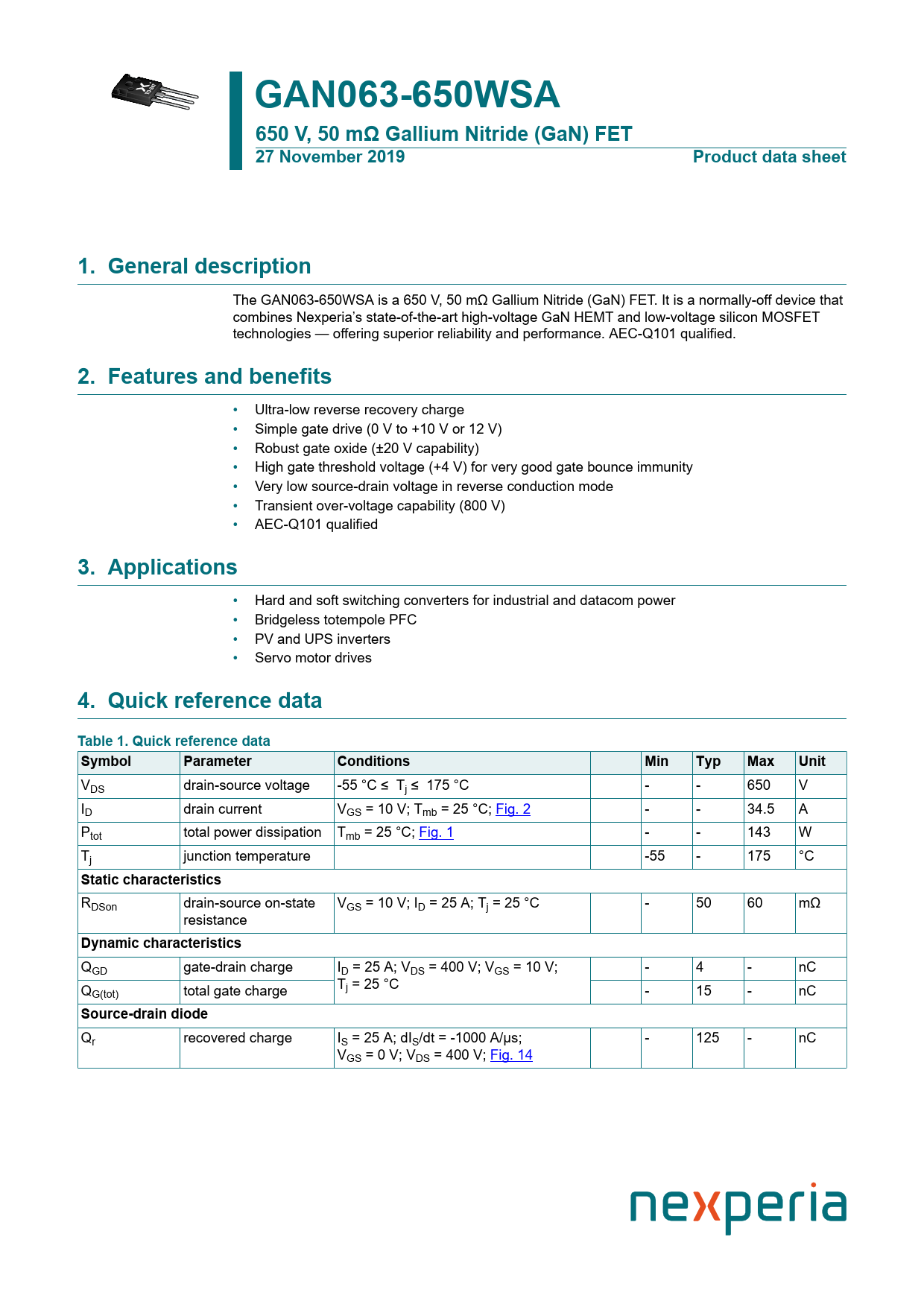 link to page 3 link to page 3 link to page 8 GAN063-650WSA650 V, 50 mΩ Gal ium Nitride (GaN) FET27 November 2019Product data sheet1. General description The GAN063-650WSA is a 650 V, 50 mΩ Gal ium Nitride (GaN) FET. It is a normal y-of device that combines Nexperia’s state-of-the-art high-voltage GaN HEMT and low-voltage silicon MOSFET technologies — of ering superior reliability and performance. AEC-Q101 qualified. 2. Features and benefits • Ultra-low reverse recovery charge • Simple gate drive (0 V to +10 V or 12 V) • Robust gate oxide (±20 V capability) • High gate threshold voltage (+4 V) for very good gate bounce immunity • Very low source-drain voltage in reverse conduction mode • Transient over-voltage capability (800 V) • AEC-Q101 qualified 3. Applications • Hard and soft switching converters for industrial and datacom power • Bridgeless totempole PFC • PV and UPS inverters • Servo motor drives 4. Quick reference data Table 1. Quick reference dataSymbolParameterConditionsMinTypMaxUnit VDS drain-source voltage -55 °C ≤ Tj ≤ 175 °C - - 650 V ID drain current VGS = 10 V; Tmb = 25 °C; Fig. 2 - - 34.5 A Ptot total power dissipation Tmb = 25 °C; Fig. 1 - - 143 W Tj junction temperature -55 - 175 °C Static characteristics RDSon drain-source on-state VGS = 10 V; ID = 25 A; Tj = 25 °C - 50 60 mΩ resistance Dynamic characteristics QGD gate-drain charge ID = 25 A; VDS = 400 V; VGS = 10 V; - 4 - nC Q T G(tot) total gate charge j = 25 °C - 15 - nC Source-drain diode Qr recovered charge IS = 25 A; dIS/dt = -1000 A/µs; - 125 - nC VGS = 0 V; VDS = 400 V; Fig. 14 Document Outline 1. General description 2. Features and benefits 3. Applications 4. Quick reference data 5. Pinning information 6. Ordering information 7. Marking 8. Limiting values 9. Thermal characteristics 10. Characteristics 11. Application information 12. Package outline 13. Legal information Contents