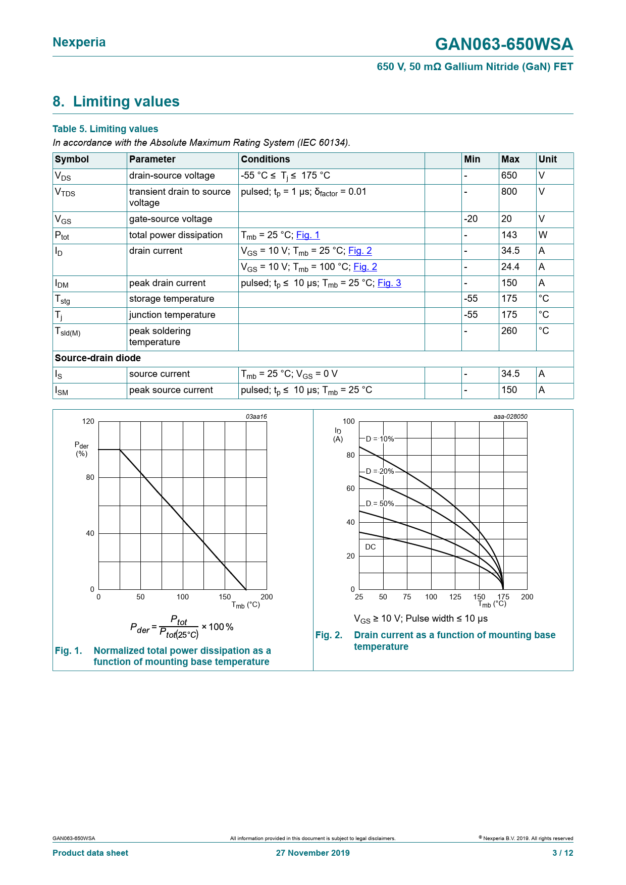 Nexperia GAN063-650WSA 650 V, 50 mΩ Gal ium Nitride (GaN) FET 8. Limiting values Table 5. Limiting values