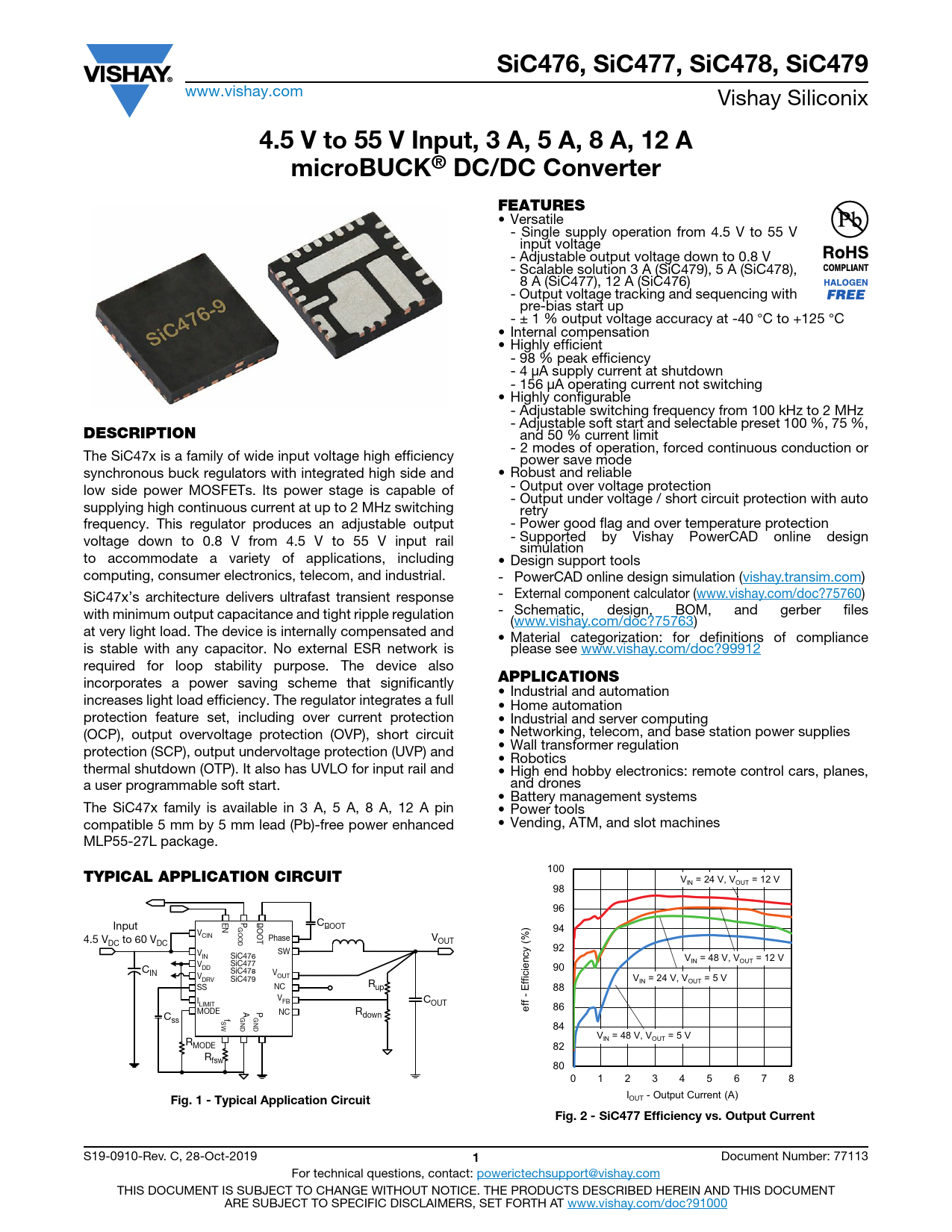 SiC476, SiC477, SiC478, SiC479 www.vishay.com Vishay Siliconix 4.5 V to 55 V Input, 3 A, 5 A, 8 A, 12 AmicroBUCK® DC/DC ConverterFEATURES • Versatile - Single supply operation from 4.5 V to 55 V input voltage - Adjustable output voltage down to 0.8 V - Scalable solution 3 A (SiC479), 5 A (SiC478), 8 A (SiC477), 12 A (SiC476) - Output voltage tracking and sequencing with pre-bias start up - ± 1 % output voltage accuracy at -40 °C to +125 °C • Internal compensation • Highly efficient - 98 % peak efficiency - 4 μA supply current at shutdown - 156 μA operating current not switching • Highly configurable - Adjustable switching frequency from 100 kHz to 2 MHz - Adjustable soft start and selectable preset 100 %, 75 %, DESCRIPTION and 50 % current limit - 2 modes of operation, forced continuous conduction or The SiC47x is a family of wide input voltage high efficiency power save mode synchronous buck regulators with integrated high side and • Robust and reliable low side power MOSFETs. Its power stage is capable of - Output over voltage protection - Output under voltage / short circuit protection with auto supplying high continuous current at up to 2 MHz switching retry frequency. This regulator produces an adjustable output - Power good flag and over temperature protection voltage down to 0.8 V from 4.5 V to 55 V input rail - Supported by Vishay PowerCAD online design simulation to accommodate a variety of applications, including • Design support tools computing, consumer electronics, telecom, and industrial. - PowerCAD online design simulation (vishay.transim.com) SiC47x’s architecture delivers ultrafast transient response - External component calculator (www.vishay.com/doc?75760) with minimum output capacitance and tight ripple regulation - Schematic, design, BOM, and gerber files (www.vishay.com/doc?75763) at very light load. The device is internally compensated and • Material categorization: for definitions of compliance is stable with any capacitor. No external ESR network is please see www.vishay.com/doc?99912 required for loop stability purpose. The device also APPLICATIONS incorporates a power saving scheme that significantly • Industrial and automation increases light load efficiency. The regulator integrates a full • Home automation protection feature set, including over current protection • Industrial and server computing (OCP), output overvoltage protection (OVP), short circuit • Networking, telecom, and base station power supplies protection (SCP), output undervoltage protection (UVP) and • Wall transformer regulation • Robotics thermal shutdown (OTP). It also has UVLO for input rail and • High end hobby electronics: remote control cars, planes, a user programmable soft start. and drones • Battery management systems The SiC47x family is available in 3 A, 5 A, 8 A, 12 A pin • Power tools compatible 5 mm by 5 mm lead (Pb)-free power enhanced • Vending, ATM, and slot machines MLP55-27L package. Axis Title 100 10000 TYPICAL APPLICATION CIRCUIT V = 24 V, V = 12 V IN OUT 98 96 EN P BOOT C G Input BOOT OOD ) 94 VCIN 1000 Phase V 4.5 V OUT DC to 60 VDC (% 92 V SW IN SiC476 V = 48 V, V = 12 V IN OUT ne ne V SiC477 ine DD C iency 90 IN SiC478 V c V OUT DRV SiC479 V = 24 V, V = 5 V R ffi IN OUT 1st li 2nd l 2nd li SS NC up E 88 V I FB C 100 LIMIT OUT eff - 86 MODE A P NC R G G C f down ss S ND ND W 84 V = 48 V, V = 5 V R IN OUT MODE 82 Rfsw 80 10 0 1 2 3 4 5 6 7 8 Fig. 1 - Typical Application Circuit I - Output Current (A) OUT Fig. 2 - SiC477 Efficiency vs. Output Current S19-0910-Rev. C, 28-Oct-2019 1 Document Number: 77113 For technical questions, contact: powerictechsupport@vishay.com THIS DOCUMENT IS SUBJECT TO CHANGE WITHOUT NOTICE. THE PRODUCTS DESCRIBED HEREIN AND THIS DOCUMENT ARE SUBJECT TO SPECIFIC DISCLAIMERS, SET FORTH AT www.vishay.com/doc?91000