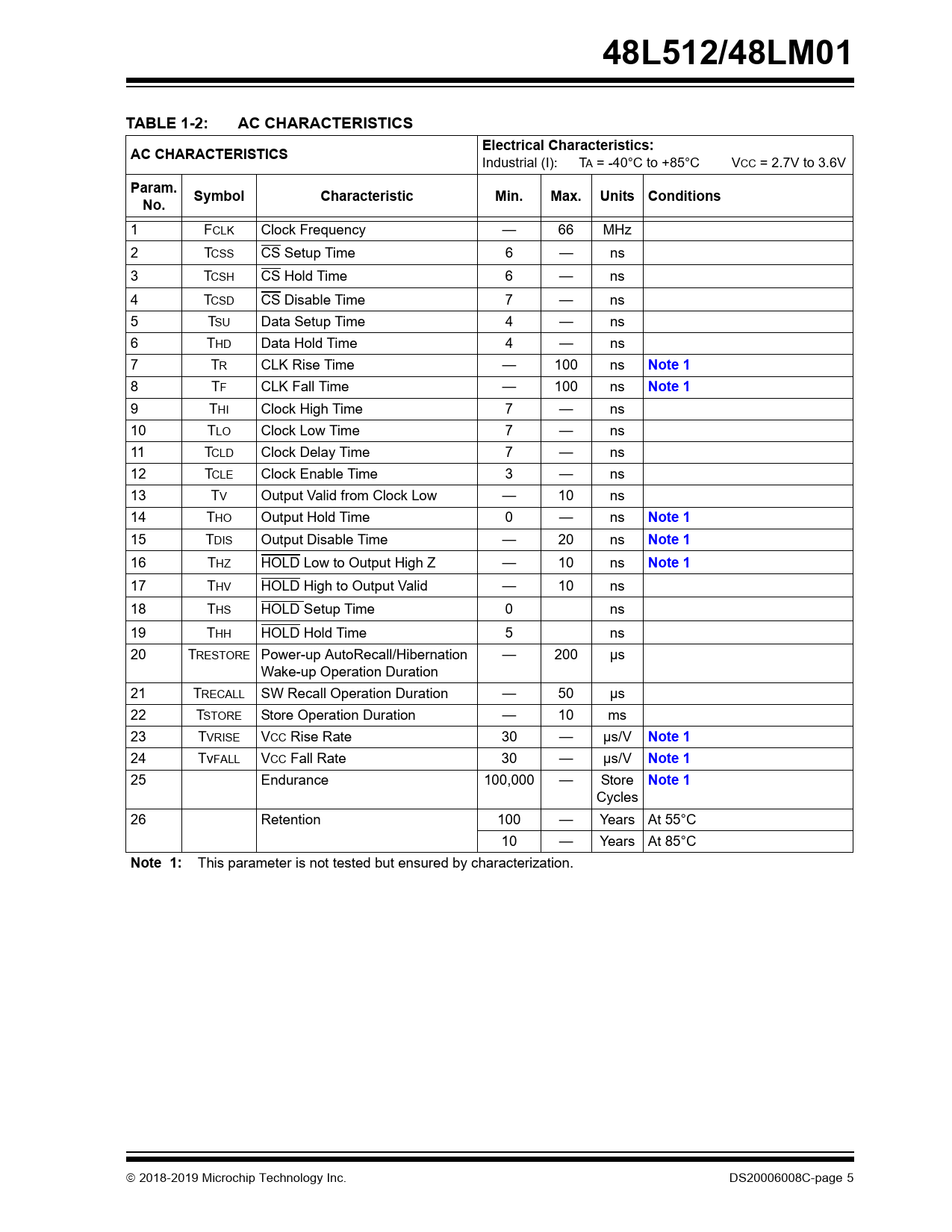 link to page 5 link to page 5 link to page 5 link to page 5 link to page 5 link to page 5 link to page 5 link to page 5 48L512/48LM01TABLE 1-2:AC CHARACTERISTICSElectrical Characteristics:AC CHARACTERISTICS Industrial (I): TA = -40°C to +85°C VCC = 2.7V to 3.6V Param.SymbolCharacteristicMin.Max.Units ConditionsNo. 1 FCLK Clock Frequency — 66 MHz 2 TCSS CS Setup Time 6 — ns 3 TCSH CS Hold Time 6 — ns 4 TCSD CS Disable Time 7 — ns 5 TSU Data Setup Time 4 — ns 6 THD Data Hold Time 4 — ns 7 TR CLK Rise Time — 100 ns Note 1 8 TF CLK Fall Time — 100 ns Note 1 9 THI Clock High Time 7 — ns 10 TLO Clock Low Time 7 — ns 11 TCLD Clock Delay Time 7 — ns 12 TCLE Clock Enable Time 3 — ns 13 TV Output Valid from Clock Low — 10 ns 14 THO Output Hold Time 0 — ns Note 1 15 TDIS Output Disable Time — 20 ns Note 1 16 THZ HOLD Low to Output High Z — 10 ns Note 1 17 THV HOLD High to Output Valid — 10 ns 18 THS HOLD Setup Time 0 ns 19 THH HOLD Hold Time 5 ns 20 TRESTORE Power-up AutoRecal /Hibernation — 200 μs Wake-up Operation Duration 21 TRECALL SW Recall Operation Duration — 50 μs 22 TSTORE Store Operation Duration — 10 ms 23 TVRISE VCC Rise Rate 30 — μs/V Note 1 24 TvFALL VCC Fall Rate 30 — μs/V Note 1 25 Endurance 100,000 — Store Note 1 Cycles 26 Retention 100 — Years At 55°C 10 — Years At 85°C Note 1: This parameter is not tested but ensured by characterization. 2018-2019 Microchip Technology Inc. DS20006008C-page 5 Document Outline Serial SRAM Features Hidden EEPROM Backup Features Other Features of the 48L512/48LM01 Packages Package Types (not to scale) Pin Function Table General Description Block Diagram Normal Device Operation Vcc Power-Off Event 1.0 Electrical Characteristics Absolute Maximum Ratings† TABLE 1-1: DC Characteristics TABLE 1-2: AC Characteristics TABLE 1-3: AC Test Conditions 2.0 Pin Descriptions TABLE 2-1: Pin Function Table 2.1 Chip Select (CS) 2.2 Serial Output (SO) 2.3 Serial Input (SI) 2.4 Serial Clock (SCK) 2.5 Hold (HOLD) 3.0 Memory Organization 3.1 Data Array Organization 3.2 16-Byte Nonvolatile User Space 3.3 Device Registers 3.3.1 STATUS Register 4.0 Functional Description FIGURE 4-1: SPI Mode 0 and Mode 3 4.1 Interfacing the 48L512/48LM01 on the SPI Bus 4.1.1 Selecting the Device 4.1.2 Sending Data to the Device 4.1.3 Receiving Data from the Device 4.2 Device Opcodes 4.2.1 Serial Opcode 4.2.2 Hold Function FIGURE 4-2: Hold Mode 5.0 Write Enable and Disable 5.1 Write Enable Instruction (WREN) FIGURE 5-1: WREN Waveform 5.2 Write Disable Instruction (WRDI) FIGURE 5-2: WRDI Waveform 6.0 STATUS Register 6.1 Block Write-Protect Bits TABLE 6-2: Block Write-Protect Bits 6.2 Write Enable Latch 6.3 Ready/Busy Status Latch 6.4 Read STATUS Register (RDSR) FIGURE 6-1: RDSR Waveform 6.5 Write STATUS Register (WRSR) FIGURE 6-2: WRSR Waveform 7.0 Read Operations 7.1 Reading from the SRAM (READ) FIGURE 7-1: Read SRAM (READ) Waveform 8.0 Write Commands 8.1 Write Instruction Sequences 8.1.1 SRAM Byte Write FIGURE 8-1: SRAM Byte Write Waveform 8.1.2 Continuous Write FIGURE 8-2: Continuous SRAM Write Waveform 9.0 Nonvolatile User Space Access 9.1 Write Nonvolatile User Space (WRNUR) 9.2 Read Nonvolatile User Space (RDNUR) 10.0 Secure Operations 10.1 Secure Write 10.2 Secure Read TABLE 10-1: Secure Write Bits 11.0 Store/Recall Operations 11.1 Automatic Store on Any Power Disruption 11.2 Automatic Recall to SRAM 11.3 Software Store Command FIGURE 11-1: Software Store 11.4 Software Recall Command FIGURE 11-2: Software Recall 11.5 Polling Routine FIGURE 11-3: Polling Flow FIGURE 11-4: AutoStore/AutoRecall Scenarios (with ASE = 0, Array Modified) FIGURE 11-5: AutoStore/AutoRecall Scenarios (with ASE = 1 or Array Not Modified) 12.0 Hibernation FIGURE 12-1: Hibernate Waveform 13.0 Trip Voltage 13.1 Power Switchover 14.0 Packaging Information 14.1 Package Marking Information Appendix A: Revision History Product ID System Trademarks Worldwide Sales