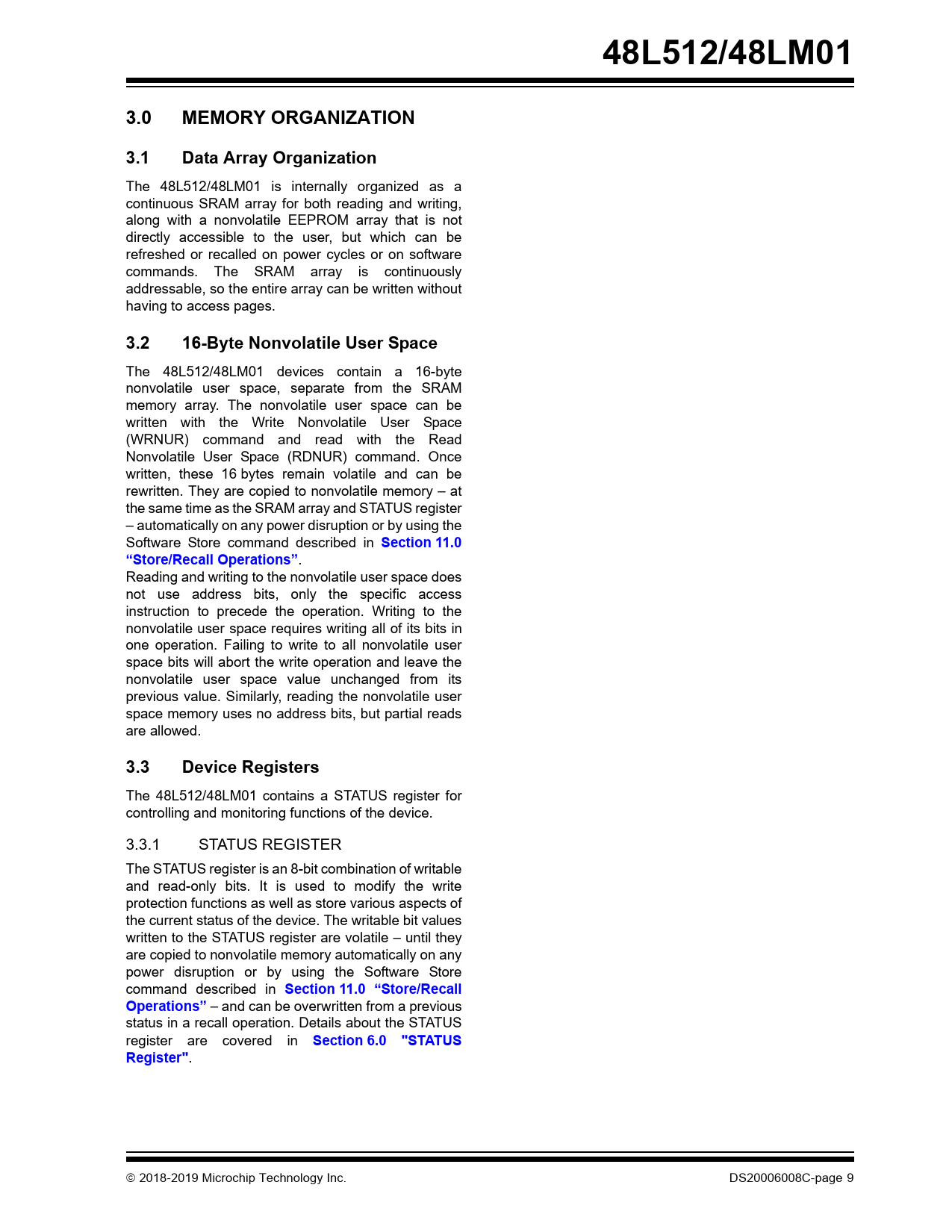 The 48L512/48LM01 contains a STATUS register for controlling and monitoring functions of the device. 3.3.1 STATUS REGISTER The STATUS register is an 8-bit combination of writable and read-only bits. It is used to modify the write protection functions as well as store various aspects of the current status of the device. The writable bit values written to the STATUS register are volatile – until they are copied to nonvolatile memory automatically on any power disruption or by using the Software Store command described in