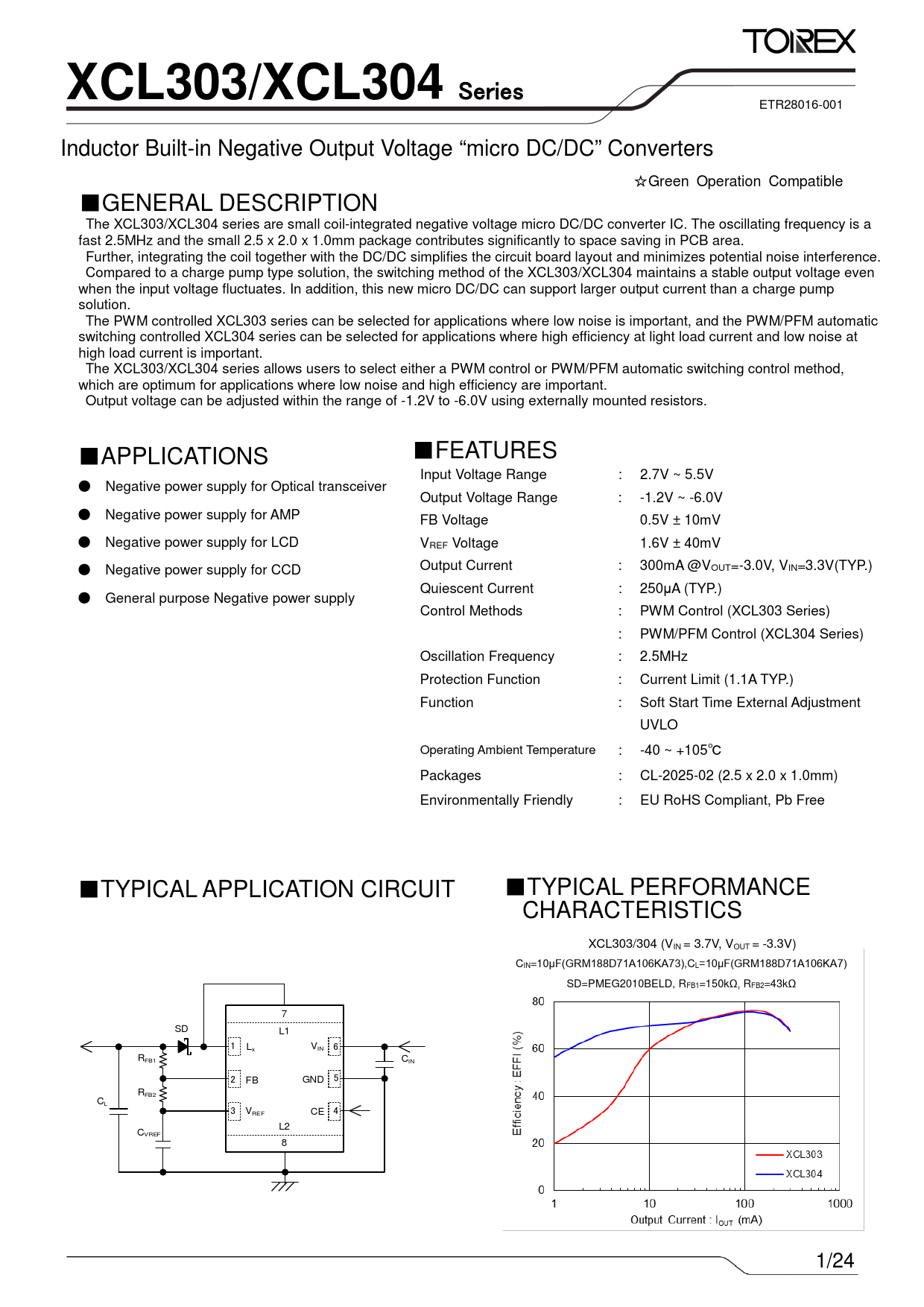XCL303/XCL304 Series ETR28016-001 Inductor Built-in Negative Output Voltage “micro DC/DC” Converters ☆Green Operation Compatible ■GENERAL DESCRIPTION The XCL303/XCL304 series are small coil-integrated negative voltage micro DC/DC converter IC. The oscillating frequency is a fast 2.5MHz and the small 2.5 x 2.0 x 1.0mm package contributes significantly to space saving in PCB area. Further, integrating the coil together with the DC/DC simplifies the circuit board layout and minimizes potential noise interference. Compared to a charge pump type solution, the switching method of the XCL303/XCL304 maintains a stable output voltage even when the input voltage fluctuates. In addition, this new micro DC/DC can support larger output current than a charge pump solution. The PWM controlled XCL303 series can be selected for applications where low noise is important, and the PWM/PFM automatic switching controlled XCL304 series can be selected for applications where high efficiency at light load current and low noise at high load current is important. The XCL303/XCL304 series allows users to select either a PWM control or PWM/PFM automatic switching control method, which are optimum for applications where low noise and high efficiency are important. Output voltage can be adjusted within the range of -1.2V to -6.0V using externally mounted resistors. ■ ■ FEATURES APPLICATIONS Input Voltage Range : 2.7V ~ 5.5V ● Negative power supply for Optical transceiver Output Voltage Range : -1.2V ~ -6.0V ● Negative power supply for AMP FB Voltage 0.5V ± 10mV ● Negative power supply for LCD VREF Voltage 1.6V ± 40mV Output Current : 300mA @V OUT=-3.0V, VIN=3.3V(TYP.) ● Negative power supply for CCD Quiescent Current : 250μA (TYP.) ● General purpose Negative power supply Control Methods : PWM Control (XCL303 Series) : PWM/PFM Control (XCL304 Series) Oscillation Frequency : 2.5MHz Protection Function : Current Limit (1.1A TYP.) Function : Soft Start Time External Adjustment UVLO Operating Ambient Temperature : -40 ~ +105℃ Packages : CL-2025-02 (2.5 x 2.0 x 1.0mm) Environmentally Friendly : EU RoHS Compliant, Pb Free ■TYPICAL APPLICATION CIRCUIT ■TYPICAL PERFORMANCE CHARACTERISTICS XCL303/304 (VIN = 3.7V, VOUT = -3.3V) CIN=10μF(GRM188D71A106KA73),CL=10μF(GRM188D71A106KA7) SD=PMEG2010BELD, RFB1=150kΩ, RFB2=43kΩ 7 SD L1 1 L VIN 6 x RFB1 CIN 2 GND 5 FB RFB2 CL 3 VREF CE 4 L2 CVREF 8 1/24