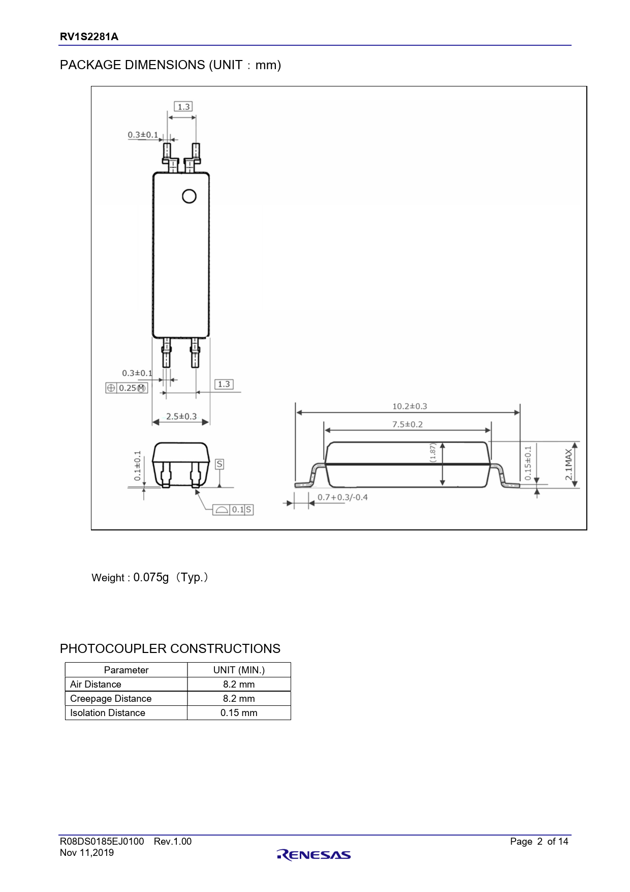 RV1S2281A 章題 PACKAGE DIMENSIONS (UNIT:mm) Weight : 0.075g(Typ.) PHOTOCOUPLER CONSTRUCTIONS Parameter UNIT (MIN.) Air Distance 8.2 mm Creepage Distance 8.2 mm Isolation Distance 0.15 mm R08DS0185EJ0100 Rev.1.00 Page 2 of 14 Nov 11,2019