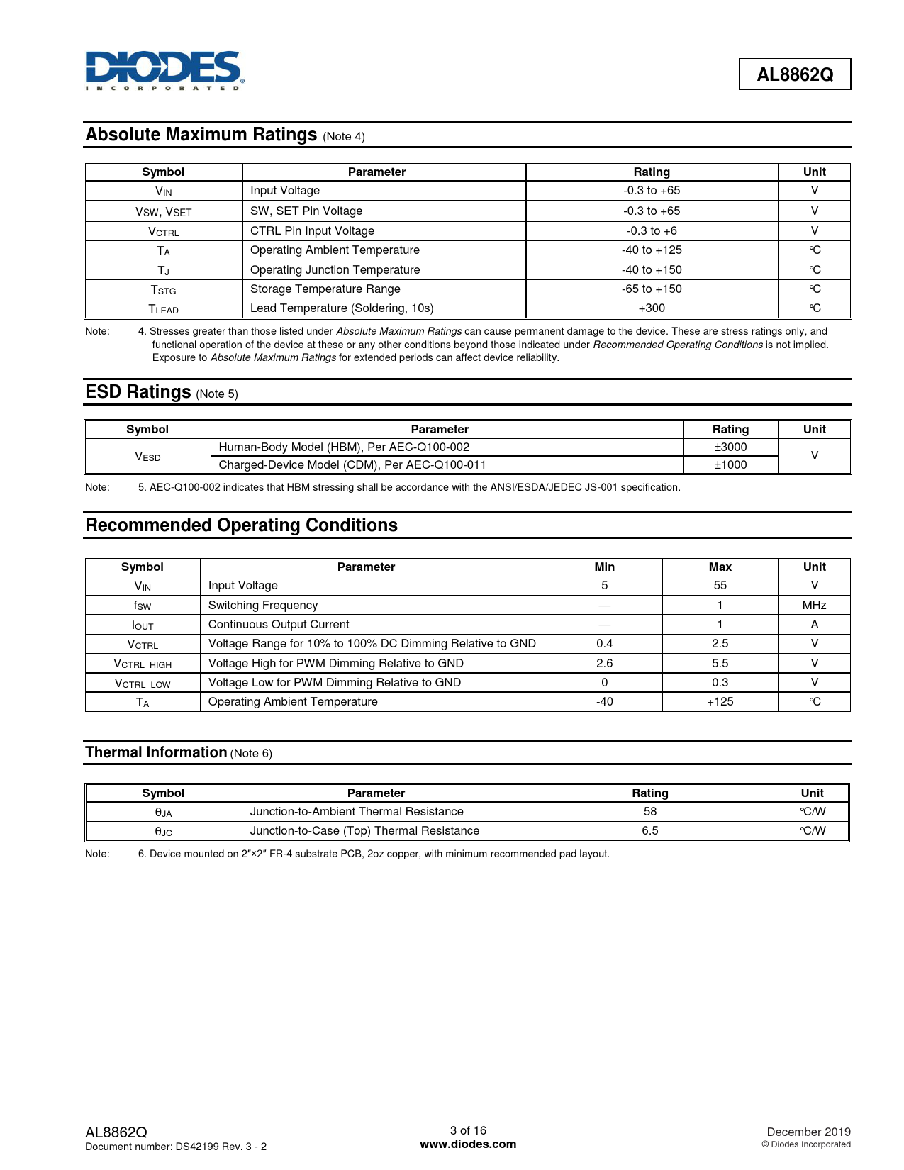 AL8862Q. Absolute Maximum Ratings. Symbol. Parameter. Rating. Unit. ESD Ratings. Recommended Operating Conditions. Min. Max