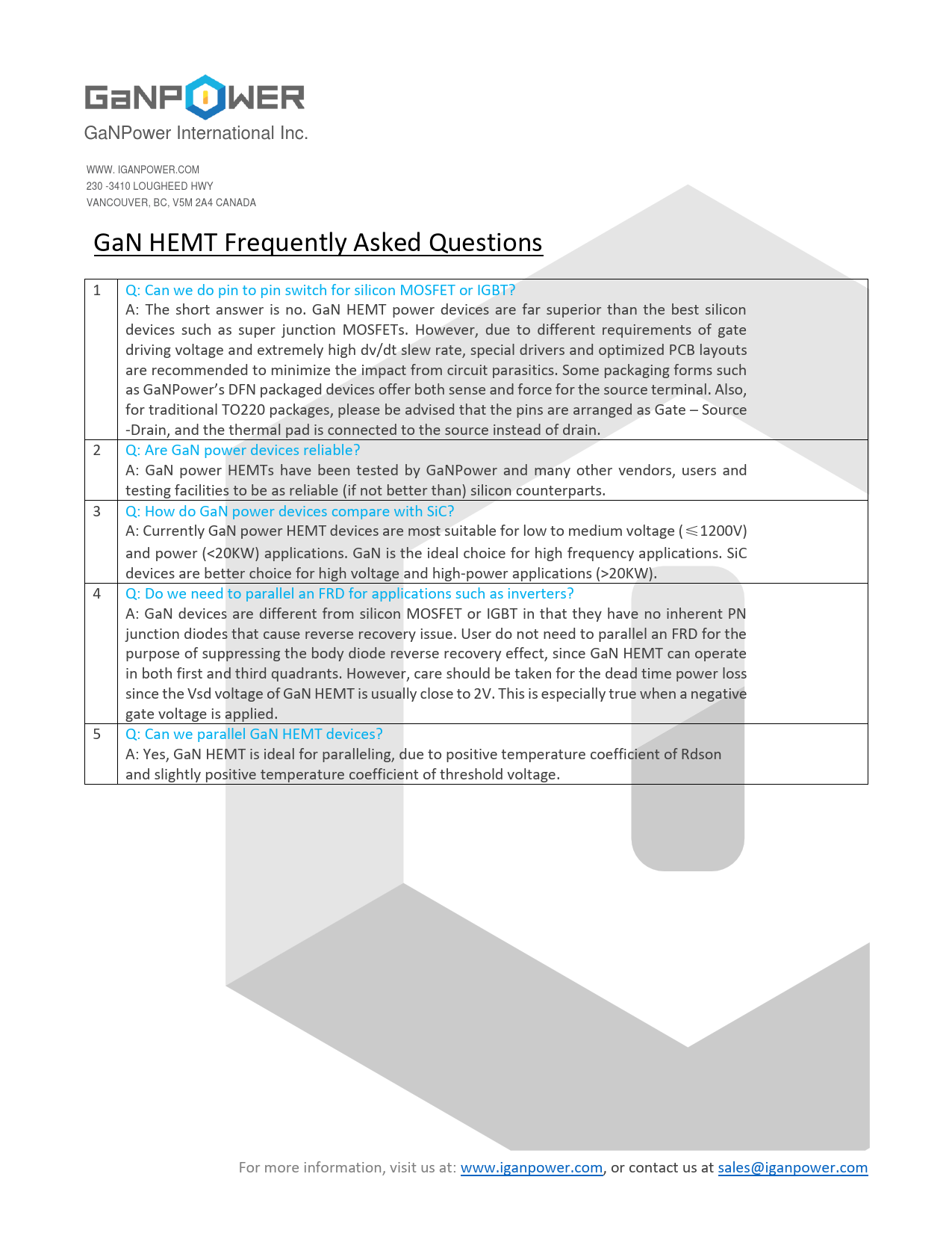 GaNPower. International. Inc. WWW. IGANPOWER.COM. 230. -3410. LOUGHEED. HWY. VANCOUVER,. BC,. V5M. 2A4. CANADA. GaN. HEMT. Frequently. Asked. Questions. 1. Q: