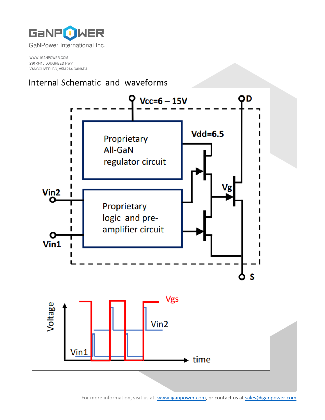 GaNPower International Inc. WWW. IGANPOWER.COM 230 -3410 LOUGHEED HWY VANCOUVER, BC, V5M 2A4 CANADA Internal Schematic and waveforms For more information, visit us at: www.iganpower.com, or contact us at sales@iganpower.com
