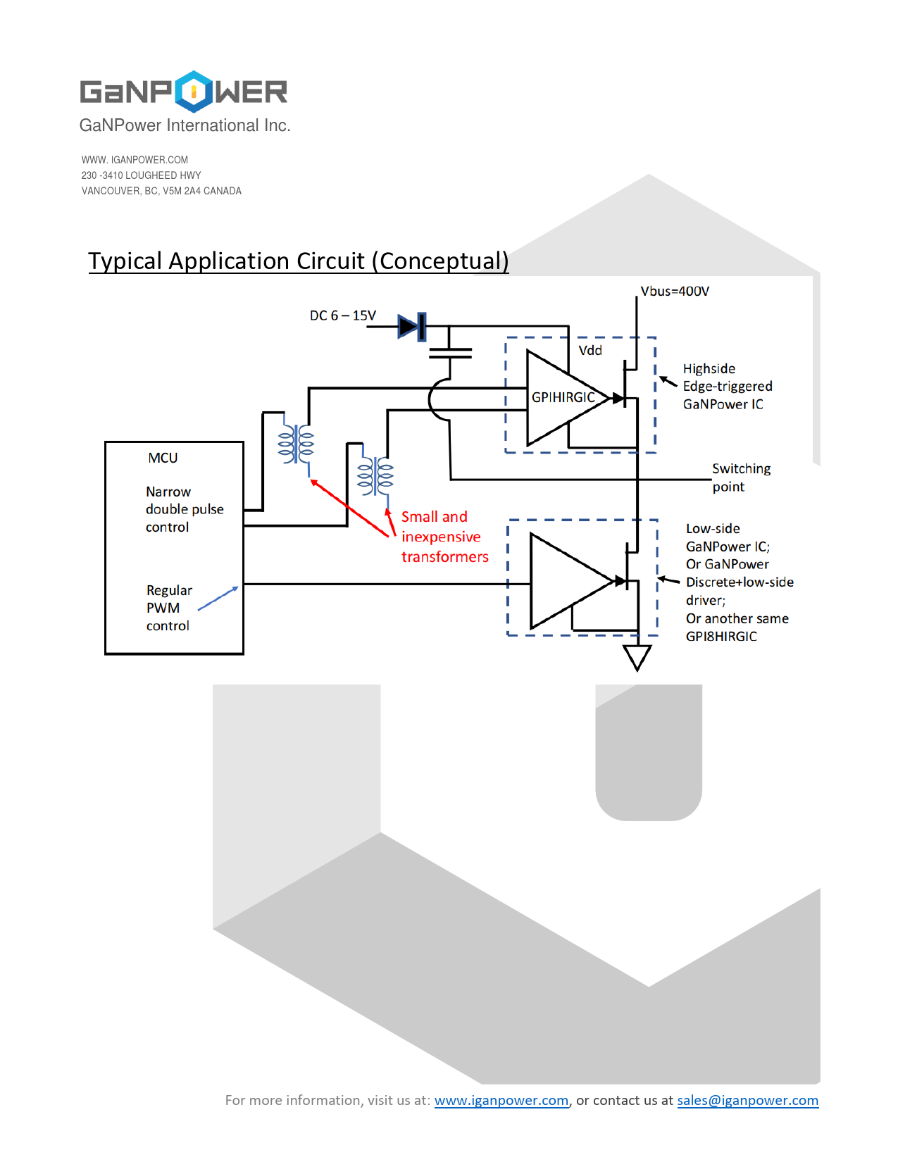 GaNPower International Inc. WWW. IGANPOWER.COM 230 -3410 LOUGHEED HWY VANCOUVER, BC, V5M 2A4 CANADA Typical Application Circuit (Conceptual) For more information, visit us at: www.iganpower.com, or contact us at sales@iganpower.com