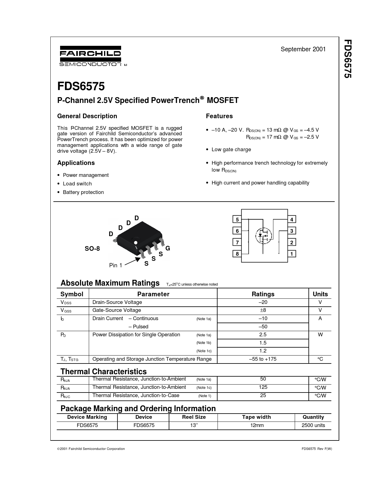 Device Marking Device Reel Size Tape width Quantity FDS6575 FDS6575 13’’ 12mm 2500 units 2001 Fairchild Semiconductor Corporation FDS6575 Rev F(W) FDS6575 September 2001