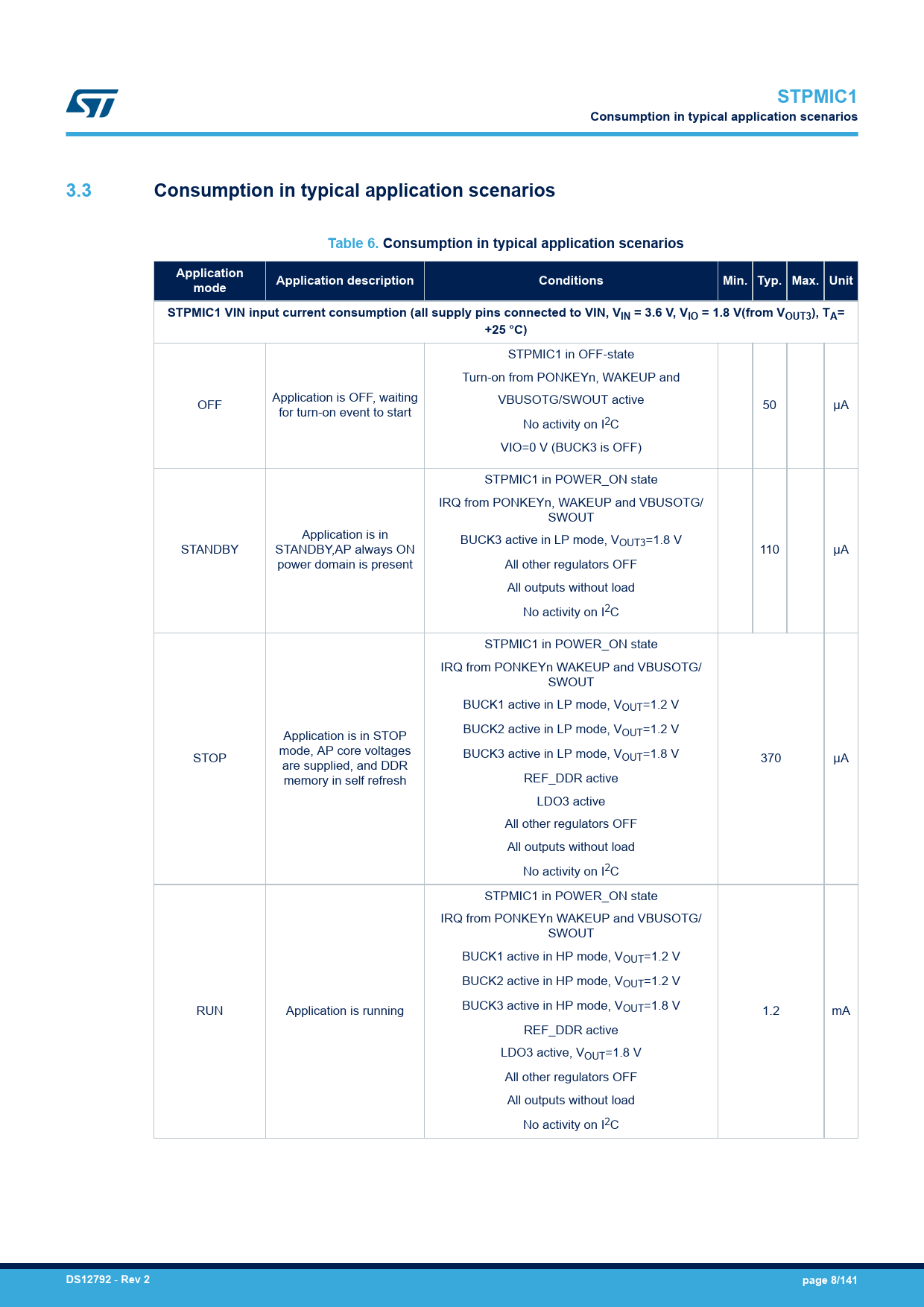 STPMIC1. Consumption in typical application scenarios. 3.3. Table 6. Consumption in typical application scenarios. Application