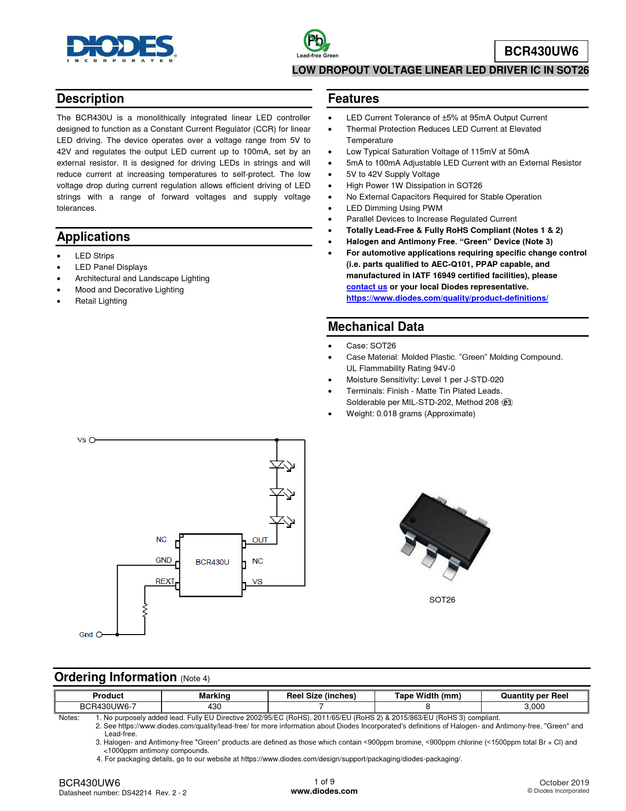 BCR430UW6-7 430 7 8 3,000 Notes: 1. No purposely added lead. Fully EU Directive 2002/95/EC (RoHS), 2011/65/EU (RoHS 2) & 2015/863/EU (RoHS 3) compliant. 2. See https://www.diodes.com/quality/lead-free/ for more information about Diodes Incorporated’s definitions of Halogen- and Antimony-free, "Green" and Lead-free. 3. Halogen- and Antimony-free "Green” products are defined as those which contain <900ppm bromine, <900ppm chlorine (<1500ppm total Br + Cl) and <1000ppm antimony compounds. 4. For packaging details, go to our website at https://www.diodes.com/design/support/packaging/diodes-packaging/. BCR430UW6 1 of 9 October 2019 Datasheet number: DS42214 Rev. 2 - 2
