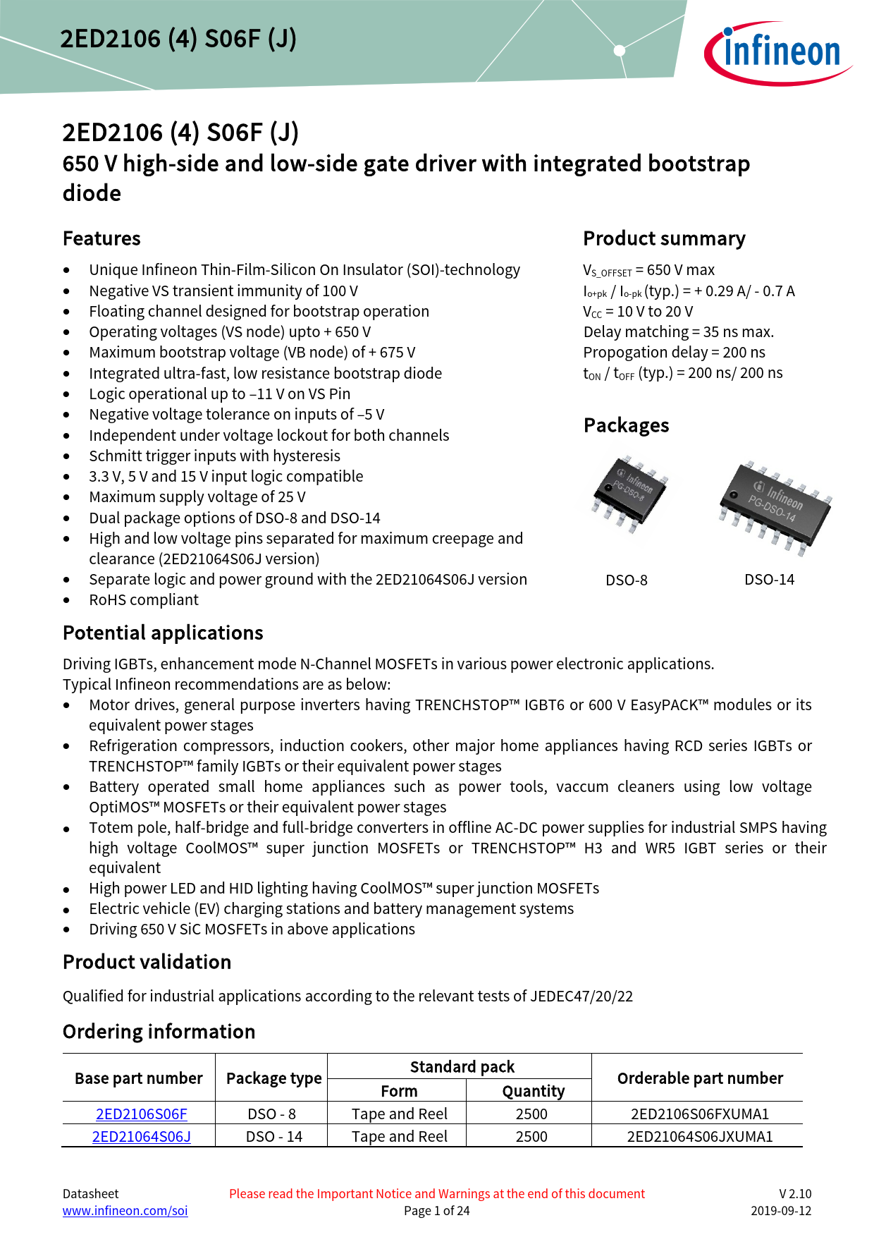 link. to. page. 24. 2ED2106. (4). S06F. (J). 2ED2106. (4). S06F. (J). 650. V. high-side. and. low-side. gate. driver. with. integrated. bootstrap. diode. Features