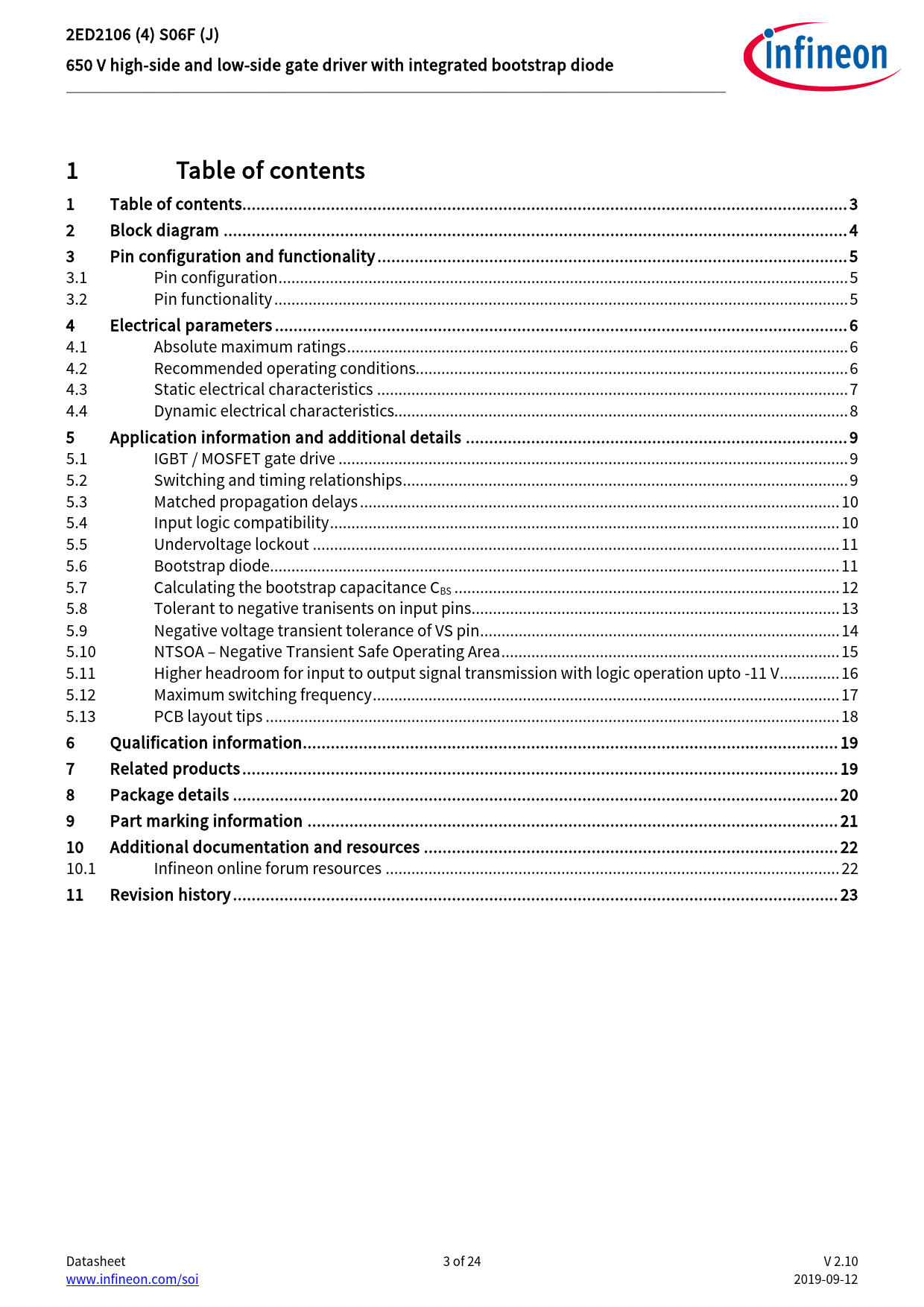 link to page 3 link to page 4 link to page 5 link to page 5 link to page 5 link to page 6 link to page 6 link to page 6 link to page 7 link to page 8 link to page 9 link to page 9 link to page 9 link to page 10 link to page 10 link to page 11 link to page 11 link to page 12 link to page 13 link to page 14 link to page 15 link to page 16 link to page 17 link to page 18 link to page 19 link to page 19 link to page 20 link to page 21 link to page 22 link to page 22 link to page 23 2ED2106 (4) S06F (J) 650 V high-side and low-side gate driver with integrated bootstrap diode 1 Table of contents 1 Table of contents.. 3 2 Block diagram .. 4 3 Pin configuration and functionality ... 5 3.1 Pin configuration ... 5 3.2 Pin functionality .. 5 4 Electrical parameters ... 6 4.1 Absolute maximum ratings ... 6 4.2 Recommended operating conditions... 6 4.3 Static electrical characteristics .. 7 4.4 Dynamic electrical characteristics.. 8 5 Application information and additional details .. 9 5.1 IGBT / MOSFET gate drive ... 9 5.2 Switching and timing relationships .. 9 5.3 Matched propagation delays .. 10 5.4 Input logic compatibility ... 10 5.5 Undervoltage lockout ... 11 5.6 Bootstrap diode ... 11 5.7 Calculating the bootstrap capacitance CBS .. 12 5.8 Tolerant to negative tranisents on input pins .. 13 5.9 Negative voltage transient tolerance of VS pin .. 14 5.10 NTSOA – Negative Transient Safe Operating Area ... 15 5.11 Higher headroom for input to output signal transmission with logic operation upto -11 V .. 16 5.12 Maximum switching frequency ... 17 5.13 PCB layout tips .. 18 6 Qualification information ... 19 7 Related products .. 19 8 Package details .. 20 9 Part marking information .. 21 10 Additional documentation and resources ... 22 10.1 Infineon online forum resources .. 22 11 Revision history .. 23 Datasheet 3 of 24 V 2.10 www.infineon.com/soi 2019-09-12 Document Outline Features Product summary Potential applications Product validation Ordering information Description 1 Table of contents 2 Block diagram 3 Pin configuration and functionality 3.1 Pin configuration 3.2 Pin functionality 4 Electrical parameters 4.1 Absolute maximum ratings 4.2 Recommended operating conditions 4.3 Static electrical characteristics 4.4 Dynamic electrical characteristics 5 Application information and additional details 5.1 IGBT / MOSFET gate drive 5.2 Switching and timing relationships 5.3 Matched propagation delays 5.4 Input logic compatibility 5.5 Undervoltage lockout 5.6 Bootstrap diode 5.7 Calculating the bootstrap capacitance CBS 5.8 Tolerant to negative tranisents on input pins 5.9 Negative voltage transient tolerance of VS pin 5.10 NTSOA – Negative Transient Safe Operating Area 5.11 Higher headroom for input to output signal transmission with logic operation upto -11 V 5.12 Maximum switching frequency 5.13 PCB layout tips 6 Qualification information0F 7 Related products 8 Package details 9 Part marking information 10 Additional documentation and resources 10.1 Infineon online forum resources 11 Revision history