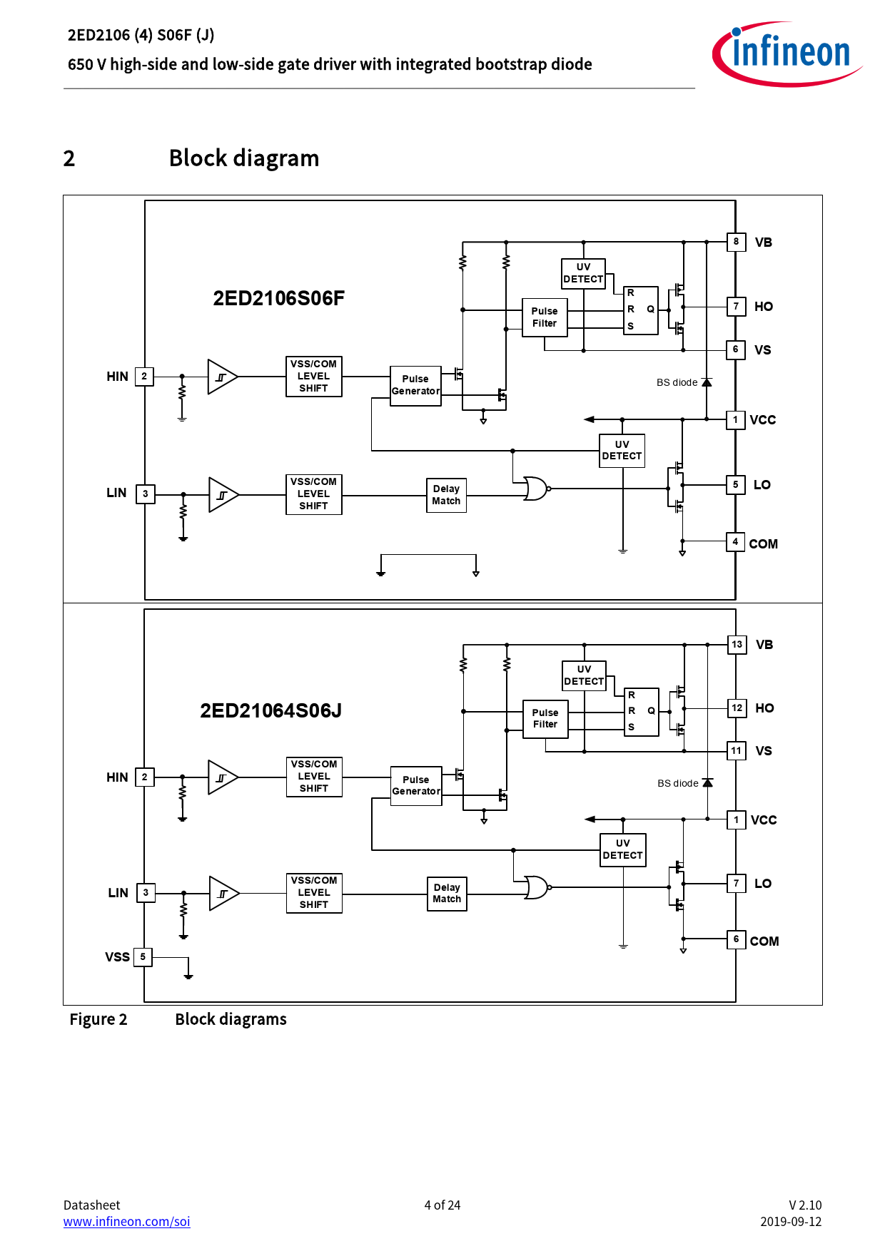 Figure 2 Block diagrams Datasheet 4 of 24 V 2.10 www.infineon.com/soi 2019-09-12 Document Outline Features Product summary Potential applications Product validation Ordering information Description 1 Table of contents 2 Block diagram 3 Pin configuration and functionality 3.1 Pin configuration 3.2 Pin functionality 4 Electrical parameters 4.1 Absolute maximum ratings 4.2 Recommended operating conditions 4.3 Static electrical characteristics 4.4 Dynamic electrical characteristics 5 Application information and additional details 5.1 IGBT / MOSFET gate drive 5.2 Switching and timing relationships 5.3 Matched propagation delays 5.4 Input logic compatibility 5.5 Undervoltage lockout 5.6 Bootstrap diode 5.7 Calculating the bootstrap capacitance CBS 5.8 Tolerant to negative tranisents on input pins 5.9 Negative voltage transient tolerance of VS pin 5.10 NTSOA – Negative Transient Safe Operating Area 5.11 Higher headroom for input to output signal transmission with logic operation upto -11 V 5.12 Maximum switching frequency 5.13 PCB layout tips 6 Qualification information0F 7 Related products 8 Package details 9 Part marking information 10 Additional documentation and resources 10.1 Infineon online forum resources 11 Revision history