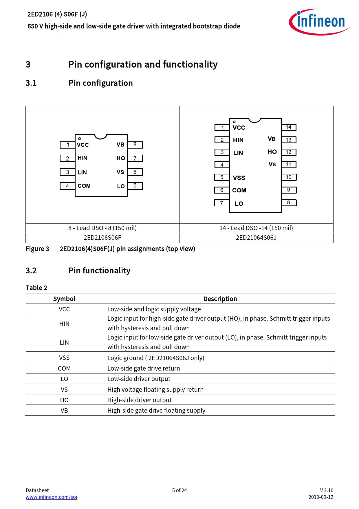 8 8 - Lead DSO - 8 (150 mil) 14 - Lead DSO -14 (150 mil) 2ED2106S06F 2ED21064S06J Figure 3 2ED2106(4)S06F(J) pin assignments (top view) 3.2 Pin functionality Table 2 Symbol Description VCC Low-side and logic supply voltage Logic input for high-side gate driver output (HO), in phase. Schmitt trigger inputs HIN with hysteresis and pull down Logic input for low-side gate driver output (LO), in phase. Schmitt trigger inputs LIN with hysteresis and pull down VSS Logic ground ( 2ED21064S06J only) COM Low-side gate drive return LO Low-side driver output VS High voltage floating supply return HO High-side driver output VB High-side gate drive floating supply Datasheet 5 of 24 V 2.10 www.infineon.com/soi 2019-09-12 Document Outline Features Product summary Potential applications Product validation Ordering information Description 1 Table of contents 2 Block diagram 3 Pin configuration and functionality 3.1 Pin configuration 3.2 Pin functionality 4 Electrical parameters 4.1 Absolute maximum ratings 4.2 Recommended operating conditions 4.3 Static electrical characteristics 4.4 Dynamic electrical characteristics 5 Application information and additional details 5.1 IGBT / MOSFET gate drive 5.2 Switching and timing relationships 5.3 Matched propagation delays 5.4 Input logic compatibility 5.5 Undervoltage lockout 5.6 Bootstrap diode 5.7 Calculating the bootstrap capacitance CBS 5.8 Tolerant to negative tranisents on input pins 5.9 Negative voltage transient tolerance of VS pin 5.10 NTSOA – Negative Transient Safe Operating Area 5.11 Higher headroom for input to output signal transmission with logic operation upto -11 V 5.12 Maximum switching frequency 5.13 PCB layout tips 6 Qualification information0F 7 Related products 8 Package details 9 Part marking information 10 Additional documentation and resources 10.1 Infineon online forum resources 11 Revision history