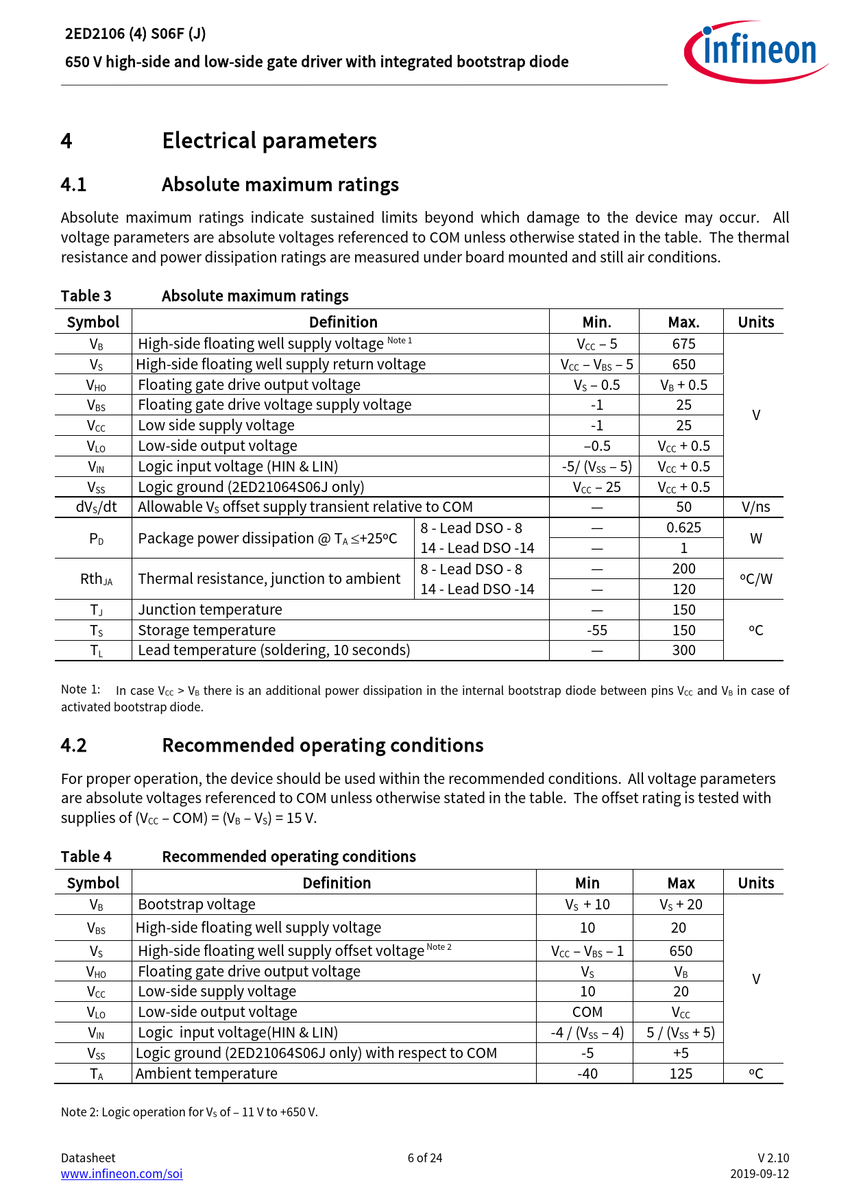 2ED2106 (4) S06F (J) 650 V high-side and low-side gate driver with integrated bootstrap diode 4 Electrical parameters 4.1 Absolute maximum ratings Absolute maximum ratings indicate sustained limits beyond which damage to the device may occur. All voltage parameters are absolute voltages referenced to COM unless otherwise stated in the table. The thermal resistance and power dissipation ratings are measured under board mounted and stil air conditions. Table 3 Absolute maximum ratings Symbol Definition Min. Max. Units VB High-side floating well supply voltage Note 1 VCC – 5 675 VS High-side floating wel supply return voltage VCC – VBS – 5 650 VHO Floating gate drive output voltage VS – 0.5 VB + 0.5 VBS Floating gate drive voltage supply voltage -1 25 V VCC Low side supply voltage -1 25 VLO Low-side output voltage –0.5 VCC + 0.5 VIN Logic input voltage (HIN & LIN) -5/ (VSS – 5) VCC + 0.5 VSS Logic ground (2ED21064S06J only) VCC – 25 VCC + 0.5 dVS/dt Allowable VS offset supply transient relative to COM — 50 V/ns — 0.625 PD Package power dissipation @ TA ≤+25ºC 8 - Lead DSO - 8 14 - Lead DSO -14 W — 1 — 200 RthJA Thermal resistance, junction to ambient 8 - Lead DSO - 8 14 - Lead DSO -14 ºC/W — 120 TJ Junction temperature — 150 TS Storage temperature -55 150 ºC TL Lead temperature (soldering, 10 seconds) — 300 Note 1: In case VCC > VB there is an additional power dissipation in the internal bootstrap diode between pins VCC and VB in case of activated bootstrap diode. 4.2 Recommended operating conditions For proper operation, the device should be used within the recommended conditions. All voltage parameters are absolute voltages referenced to COM unless otherwise stated in the table. The offset rating is tested with supplies of (VCC – COM) = (VB – VS) = 15 V. Table 4 Recommended operating conditions Symbol Definition Min Max Units VB Bootstrap voltage VS + 10 VS + 20 VBS High-side floating well supply voltage 10 20 VS High-side floating well supply offset voltage Note 2 VCC – VBS – 1 650 VHO Floating gate drive output voltage VS VB V VCC Low-side supply voltage 10 20 VLO Low-side output voltage COM VCC VIN Logic input voltage(HIN & LIN) -4 / (VSS – 4) 5 / (VSS + 5) VSS Logic ground (2ED21064S06J only) with respect to COM -5 +5 TA Ambient temperature -40 125 ºC Note 2: Logic operation for VS of – 11 V to +650 V. Datasheet 6 of 24 V 2.10 www.infineon.com/soi 2019-09-12 Document Outline Features Product summary Potential applications Product validation Ordering information Description 1 Table of contents 2 Block diagram 3 Pin configuration and functionality 3.1 Pin configuration 3.2 Pin functionality 4 Electrical parameters 4.1 Absolute maximum ratings 4.2 Recommended operating conditions 4.3 Static electrical characteristics 4.4 Dynamic electrical characteristics 5 Application information and additional details 5.1 IGBT / MOSFET gate drive 5.2 Switching and timing relationships 5.3 Matched propagation delays 5.4 Input logic compatibility 5.5 Undervoltage lockout 5.6 Bootstrap diode 5.7 Calculating the bootstrap capacitance CBS 5.8 Tolerant to negative tranisents on input pins 5.9 Negative voltage transient tolerance of VS pin 5.10 NTSOA – Negative Transient Safe Operating Area 5.11 Higher headroom for input to output signal transmission with logic operation upto -11 V 5.12 Maximum switching frequency 5.13 PCB layout tips 6 Qualification information0F 7 Related products 8 Package details 9 Part marking information 10 Additional documentation and resources 10.1 Infineon online forum resources 11 Revision history