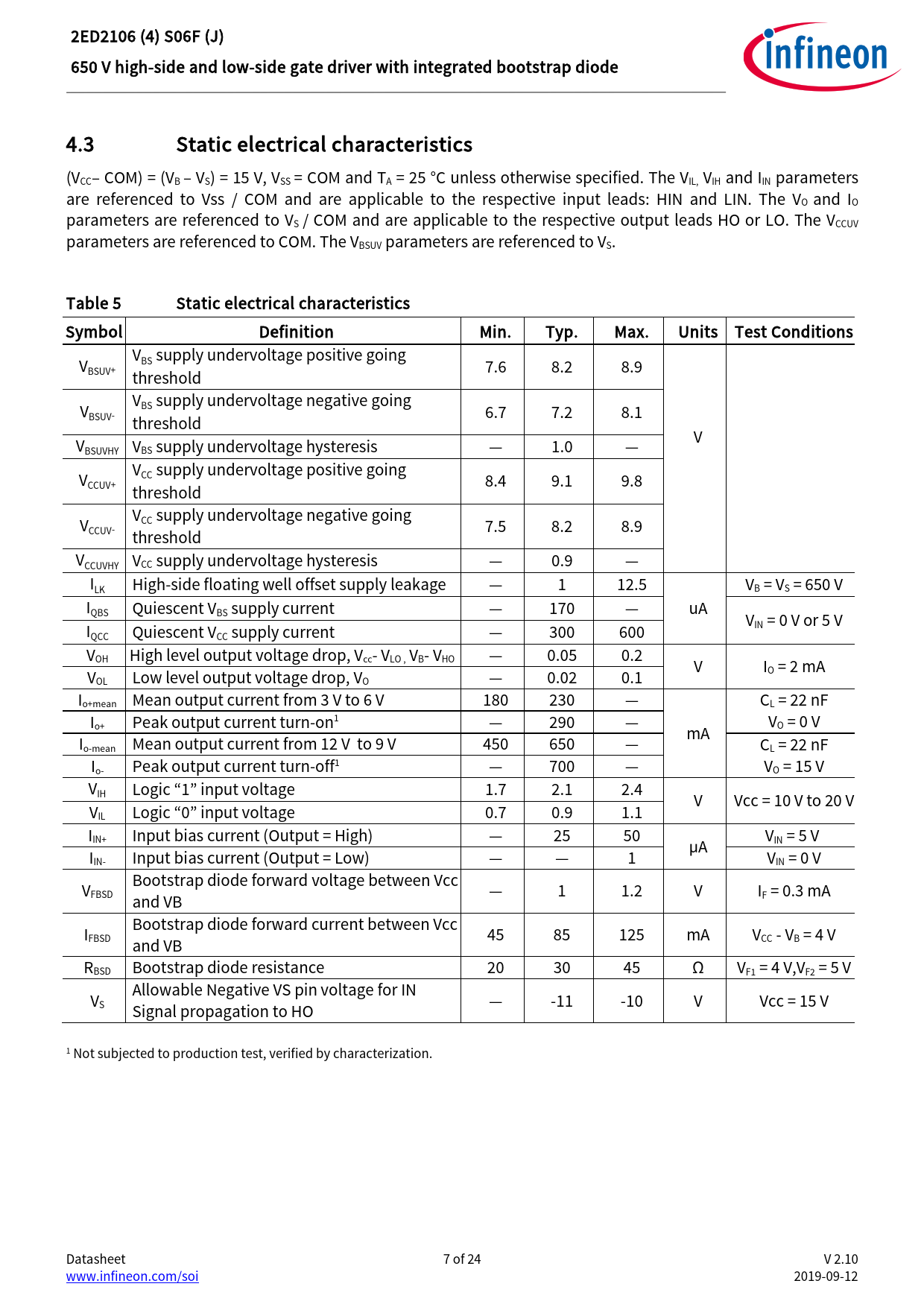 2ED2106 (4) S06F (J) 650 V high-side and low-side gate driver with integrated bootstrap diode 4.3 Static electrical characteristics (VCC– COM) = (VB – VS) = 15 V, VSS = COM and TA = 25 °C unless otherwise specified. The VIL, VIH and IIN parameters are referenced to Vss / COM and are applicable to the respective input leads: HIN and LIN. The VO and IO parameters are referenced to VS / COM and are applicable to the respective output leads HO or LO. The VCCUV parameters are referenced to COM. The VBSUV parameters are referenced to VS. Table 5 Static electrical characteristics Symbol Definition Min. Typ. Max. Units Test Conditions VBSUV+ VBS supply undervoltage positive going threshold 7.6 8.2 8.9 VBSUV- VBS supply undervoltage negative going threshold 6.7 7.2 8.1 V V BSUVHY VBS supply undervoltage hysteresis — 1.0 — VCCUV+ VCC supply undervoltage positive going threshold 8.4 9.1 9.8 VCCUV- VCC supply undervoltage negative going threshold 7.5 8.2 8.9 V CCUVHY VCC supply undervoltage hysteresis — 0.9 — I LK High-side floating wel offset supply leakage — 1 12.5 VB = VS = 650 V I QBS Quiescent VBS supply current — 170 — uA VIN = 0 V or 5 V I QCC Quiescent VCC supply current — 300 600 VOH High level output voltage drop, Vcc- VLO , VB- VHO — 0.05 0.2 V IO = 2 mA VOL Low level output voltage drop, VO — 0.02 0.1 Io+mean Mean output current from 3 V to 6 V 180 230 — CL = 22 nF Io+ Peak output current turn-on1 — 290 — V mA O = 0 V Io-mean Mean output current from 12 V to 9 V 450 650 — CL = 22 nF Io- Peak output current turn-off1 — 700 — VO = 15 V V IH Logic “1” input voltage 1.7 2.1 2.4 V Vcc = 10 V to 20 V VIL Logic “0” input voltage 0.7 0.9 1.1 IIN+ Input bias current (Output = High) — 25 50 µA VIN = 5 V IIN- Input bias current (Output = Low) — — 1 VIN = 0 V VFBSD Bootstrap diode forward voltage between Vcc and VB — 1 1.2 V IF = 0.3 mA IFBSD Bootstrap diode forward current between Vcc and VB 45 85 125 mA VCC - VB = 4 V RBSD Bootstrap diode resistance 20 30 45 Ω VF1 = 4 V,VF2 = 5 V VS Allowable Negative VS pin voltage for IN Signal propagation to HO — -11 -10 V Vcc = 15 V 1 Not subjected to production test, verified by characterization. Datasheet 7 of 24 V 2.10 www.infineon.com/soi 2019-09-12 Document Outline Features Product summary Potential applications Product validation Ordering information Description 1 Table of contents 2 Block diagram 3 Pin configuration and functionality 3.1 Pin configuration 3.2 Pin functionality 4 Electrical parameters 4.1 Absolute maximum ratings 4.2 Recommended operating conditions 4.3 Static electrical characteristics 4.4 Dynamic electrical characteristics 5 Application information and additional details 5.1 IGBT / MOSFET gate drive 5.2 Switching and timing relationships 5.3 Matched propagation delays 5.4 Input logic compatibility 5.5 Undervoltage lockout 5.6 Bootstrap diode 5.7 Calculating the bootstrap capacitance CBS 5.8 Tolerant to negative tranisents on input pins 5.9 Negative voltage transient tolerance of VS pin 5.10 NTSOA – Negative Transient Safe Operating Area 5.11 Higher headroom for input to output signal transmission with logic operation upto -11 V 5.12 Maximum switching frequency 5.13 PCB layout tips 6 Qualification information0F 7 Related products 8 Package details 9 Part marking information 10 Additional documentation and resources 10.1 Infineon online forum resources 11 Revision history