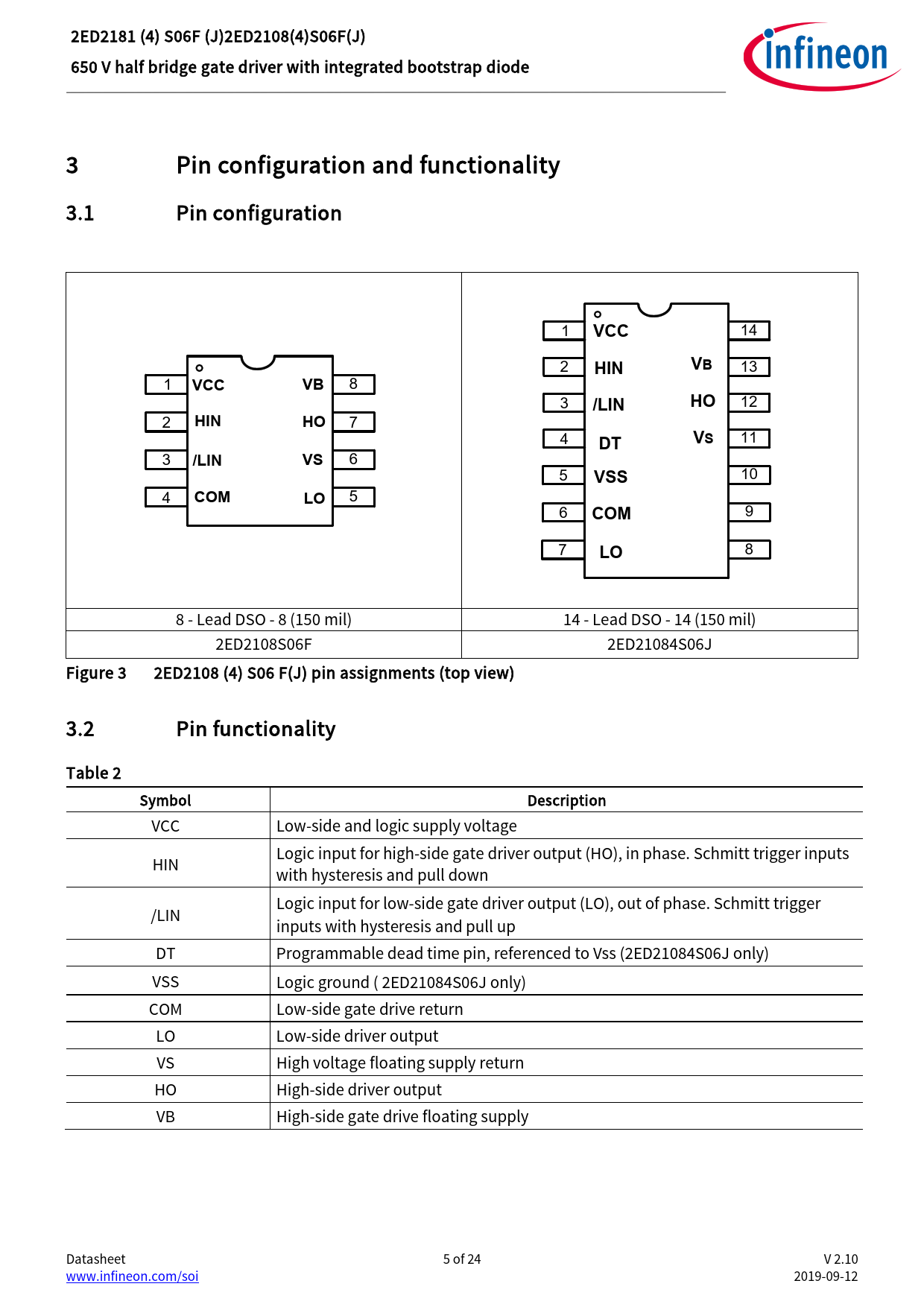 8 8 - Lead DSO - 8 (150 mil) 14 - Lead DSO - 14 (150 mil) 2ED2108S06F 2ED21084S06J Figure 3 2ED2108 (4) S06 F(J) pin assignments (top view) 3.2 Pin functionality Table 2 Symbol Description VCC Low-side and logic supply voltage Logic input for high-side gate driver output (HO), in phase. Schmitt trigger inputs HIN with hysteresis and pull down Logic input for low-side gate driver output (LO), out of phase. Schmitt trigger /LIN inputs with hysteresis and pul up DT Programmable dead time pin, referenced to Vss (2ED21084S06J only) VSS Logic ground ( 2ED21084S06J only) COM Low-side gate drive return LO Low-side driver output VS High voltage floating supply return HO High-side driver output VB High-side gate drive floating supply Datasheet 5 of 24 V 2.10 www.infineon.com/soi 2019-09-12 Document Outline Features Product summary Potential applications Product validation Ordering information Description 1 Table of contents 2 Block diagram 3 Pin configuration and functionality 3.1 Pin configuration 3.2 Pin functionality 4 Electrical parameters 4.1 Absolute maximum ratings 4.2 Recommended operating conditions 4.3 Static electrical characteristics 4.4 Dynamic electrical characteristics 5 Application information and additional details 5.1 IGBT / MOSFET gate drive 5.2 Switching and timing relationships 5.3 Deadtime 5.4 Matched propagation delays 5.5 Input logic compatibility 5.6 Undervoltage lockout 5.7 Bootstrap diode 5.8 Calculating the bootstrap capacitance CBS 5.9 Tolerant to negative tranisents on input pins 5.10 Negative voltage transient tolerance of VS pin 5.11 NTSOA – Negative Transient Safe Operating Area 5.12 Higher headroom for input to output signal transmission with logic operation upto -11 V 5.13 Maximum switching frequency 5.14 PCB layout tips 6 Qualification information0F 7 Related products 8 Package details 9 Part marking information 10 Additional documentation and resources 10.1 Infineon online forum resources 11 Revision history