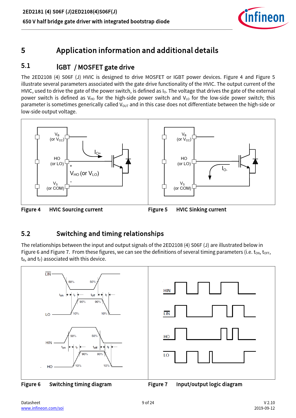 link to page 9 link to page 9 link to page 9 link to page 9 2ED2181 (4) S06F (J)2ED2108(4)S06F(J) 650 V half bridge gate driver with integrated bootstrap diode 5 Application information and additional details 5.1 IGBT / MOSFET gate drive The 2ED2108 (4) S06F (J) HVIC is designed to drive MOSFET or IGBT power devices. Figure 4 and Figure 5 il ustrate several parameters associated with the gate drive functionality of the HVIC. The output current of the HVIC, used to drive the gate of the power switch, is defined as IO. The voltage that drives the gate of the external power switch is defined as VHO for the high-side power switch and VLO for the low-side power switch; this parameter is sometimes generical y cal ed VOUT and in this case does not differentiate between the high-side or low-side output voltage. VB VB (or VCC) (or VCC) IO+ HO HO (or LO) + (or LO) I V O- HO (or VLO) V - S VS (or COM) (or COM) Figure 4 HVIC Sourcing current Figure 5 HVIC Sinking current 5.2 Switching and timing relationships The relationships between the input and output signals of the 2ED2108 (4) S06F (J) are illustrated below in Figure 6 and Figure 7. From these figures, we can see the definitions of several timing parameters (i.e. tON, tOFF, tR, and tF) associated with this device. Figure 6 Switching timing diagram Figure 7 Input/output logic diagram Datasheet 9 of 24 V 2.10 www.infineon.com/soi 2019-09-12 Document Outline Features Product summary Potential applications Product validation Ordering information Description 1 Table of contents 2 Block diagram 3 Pin configuration and functionality 3.1 Pin configuration 3.2 Pin functionality 4 Electrical parameters 4.1 Absolute maximum ratings 4.2 Recommended operating conditions 4.3 Static electrical characteristics 4.4 Dynamic electrical characteristics 5 Application information and additional details 5.1 IGBT / MOSFET gate drive 5.2 Switching and timing relationships 5.3 Deadtime 5.4 Matched propagation delays 5.5 Input logic compatibility 5.6 Undervoltage lockout 5.7 Bootstrap diode 5.8 Calculating the bootstrap capacitance CBS 5.9 Tolerant to negative tranisents on input pins 5.10 Negative voltage transient tolerance of VS pin 5.11 NTSOA – Negative Transient Safe Operating Area 5.12 Higher headroom for input to output signal transmission with logic operation upto -11 V 5.13 Maximum switching frequency 5.14 PCB layout tips 6 Qualification information0F 7 Related products 8 Package details 9 Part marking information 10 Additional documentation and resources 10.1 Infineon online forum resources 11 Revision history