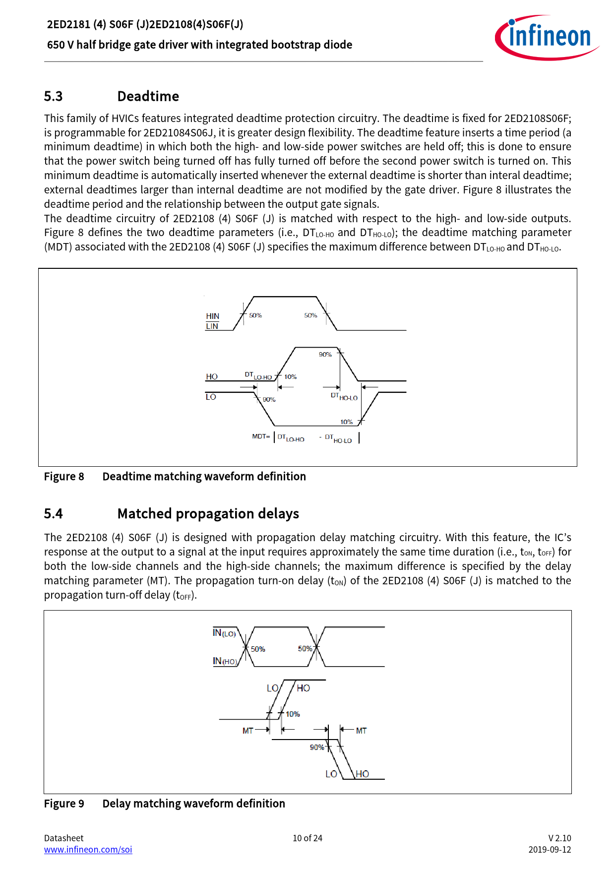 2ED2181 (4) S06F (J)2ED2108(4)S06F(J) 650 V half bridge gate driver with integrated bootstrap diode 5.3 Deadtime This family of HVICs features integrated deadtime protection circuitry. The deadtime is fixed for 2ED2108S06F; is programmable for 2ED21084S06J, it is greater design flexibility. The deadtime feature inserts a time period (a minimum deadtime) in which both the high- and low-side power switches are held off; this is done to ensure that the power switch being turned off has fully turned off before the second power switch is turned on. This minimum deadtime is automatical y inserted whenever the external deadtime is shorter than interal deadtime; external deadtimes larger than internal deadtime are not modified by the gate driver. Figure 8 il ustrates the deadtime period and the relationship between the output gate signals. The deadtime circuitry of 2ED2108 (4) S06F (J) is matched with respect to the high- and low-side outputs. Figure 8 defines the two deadtime parameters (i.e., DTLO-HO and DTHO-LO); the deadtime matching parameter (MDT) associated with the 2ED2108 (4) S06F (J) specifies the maximum difference between DTLO-HO and DTHO-LO. Figure 8 Deadtime matching waveform definition 5.4 Matched propagation delays The 2ED2108 (4) S06F (J) is designed with propagation delay matching circuitry. With this feature, the IC’s response at the output to a signal at the input requires approximately the same time duration (i.e., tON, tOFF) for both the low-side channels and the high-side channels; the maximum difference is specified by the delay matching parameter (MT). The propagation turn-on delay (tON) of the 2ED2108 (4) S06F (J) is matched to the propagation turn-off delay (tOFF). Figure 9 Delay matching waveform definition Datasheet 10 of 24 V 2.10 www.infineon.com/soi 2019-09-12 Document Outline Features Product summary Potential applications Product validation Ordering information Description 1 Table of contents 2 Block diagram 3 Pin configuration and functionality 3.1 Pin configuration 3.2 Pin functionality 4 Electrical parameters 4.1 Absolute maximum ratings 4.2 Recommended operating conditions 4.3 Static electrical characteristics 4.4 Dynamic electrical characteristics 5 Application information and additional details 5.1 IGBT / MOSFET gate drive 5.2 Switching and timing relationships 5.3 Deadtime 5.4 Matched propagation delays 5.5 Input logic compatibility 5.6 Undervoltage lockout 5.7 Bootstrap diode 5.8 Calculating the bootstrap capacitance CBS 5.9 Tolerant to negative tranisents on input pins 5.10 Negative voltage transient tolerance of VS pin 5.11 NTSOA – Negative Transient Safe Operating Area 5.12 Higher headroom for input to output signal transmission with logic operation upto -11 V 5.13 Maximum switching frequency 5.14 PCB layout tips 6 Qualification information0F 7 Related products 8 Package details 9 Part marking information 10 Additional documentation and resources 10.1 Infineon online forum resources 11 Revision history